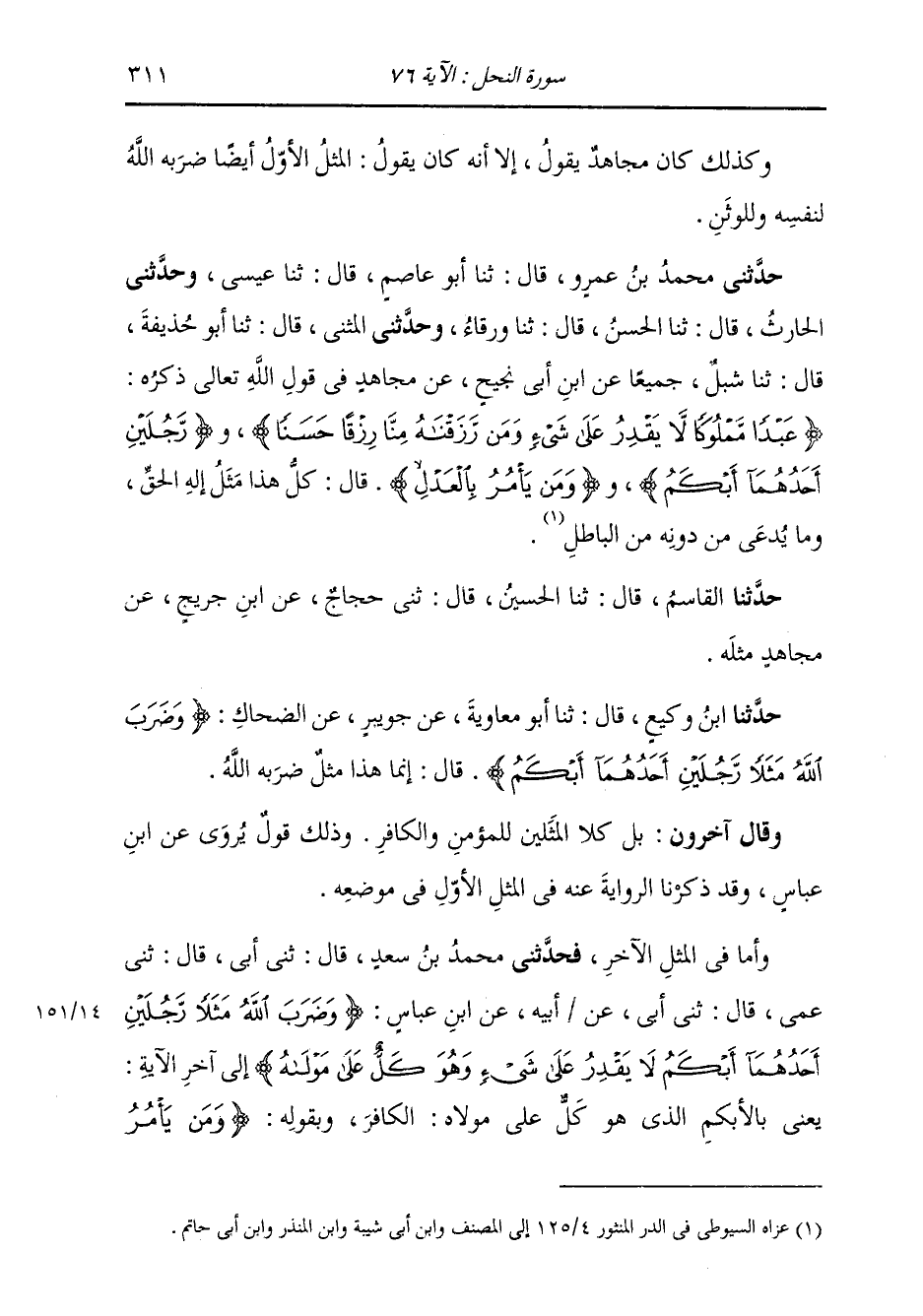 حَدَّثَنِي مُحَمَّدُ بْنُ عَمْرٍو، قَالَ: ثنا أَبُو عَاصِمٍ، قَالَ: ثنا عِيسَى، وَحَدَّثَنِي الْحَارِثُ، قَالَ: ثنا الْحَسَنُ، قَالَ: ثنا وَرْقَاءُ، وَحَدَّثَنِي الْمُثَنَّى، قَالَ: ثنا أَبُو حُذَيْفَةَ، قَالَ: ثنا شِبْلٌ، جَمِيعًا عَنِ ابْنِ أَبِي نَجِيحٍ، عَنْ مُجَاهِدٍ، فِي قَوْلِ اللَّهِ تَعَالَى ذِكْرُهُ: {§عَبْدًا مَمْلُوكًا لَا يَقْدِرُ عَلَى شَيْءٍ، وَمَنْ رَزَقْنَاهُ مِنَّا رِزْقًا حَسَنًا} [النحل: 75] {رَجُلَيْنِ أَحَدُهُمَا أَبْكَمُ} [النحل: 76] ، {وَمَنْ يَأْمُرُ بِالْعَدْلِ} [النحل: 76] قَالَ: «كُلُّ هَذَا مَثَلُ إِلَهِ الْحَقِّ، وَمَا يُدْعَى مِنْ دُونِهِ مِنَ الْبَاطِلِ» . حَدَّثَنَا الْقَاسِمُ قَالَ: ثنا الْحُسَيْنُ قَالَ: ثني حَجَّاجٌ، عَنِ ابْنِ جُرَيْجٍ، عَنْ مُجَاهِدٍ، مِثْلَهُ