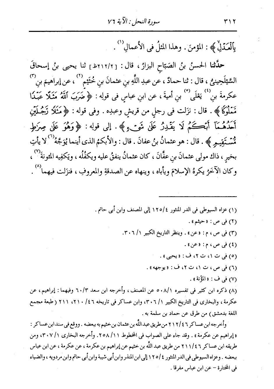 حَدَّثَنَا الْحَسَنُ بْنُ الصَّبَّاحِ الْبَزَّارُ، قَالَ: ثنا يَحْيَى بْنُ إِسْحَاقَ السَّيْلَحِينِيُّ، قَالَ: ثنا حَمَّادٌ، عَنْ عَبْدِ اللَّهِ بْنِ عُثْمَانَ بْنِ خُثَيْمٍ، عَنْ إِبْرَاهِيمَ، عَنْ عِكْرِمَةَ، عَنْ يَعْلَى بْنِ أُمَيَّةَ، عَنِ ابْنِ عَبَّاسٍ، فِي قَوْلِهِ: {§ضَرَبَ اللَّهُ مَثَلًا عَبْدًا مَمْلُوكًا} [النحل: 75] قَالَ: " نَزَلَتْ فِي رَجُلٍ مِنْ قُرَيْشٍ وَعَبْدِهِ، وَفِي قَوْلِهِ: {مَثَلًا رَجُلَيْنِ أَحَدُهُمَا أَبْكَمُ لَا يَقْدِرُ عَلَى شَيْءٍ} [النحل: 76] إِلَى قَوْلِهِ: {وَهُوَ عَلَى صِرَاطٍ مُسْتَقِيمٍ} [النحل: 76] قَالَ: «هُوَ عُثْمَانُ بْنُ عَفَّانَ» قَالَ: «وَالْأَبْكَمُ الَّذِي أَيْنَمَا يُوَجَّهُ لَا يَأْتِ بِخَيْرٍ، ذَاكَ مَوْلَى عُثْمَانَ بْنِ عَفَّانَ، كَانَ عُثْمَانُ يُنْفِقُ عَلَيْهِ وَيَكْفُلُهُ وَيَكْفِيهِ الْمَئُونَةَ، وَكَانَ الْآخَرُ يَكْرَهُ الْإِسْلَامَ وَيَأْبَاهُ وَيَنْهَاهُ عَنِ الصَّدَقَةِ وَالْمَعْرُوفِ، فَنَزَلَتْ فِيهِمَا» -[313]- وَإِنَّمَا اخْتَرْنَا الْقَوْلَ الَّذِي اخْتَرْنَاهُ فِي الْمَثَلِ الْأَوَّلِ لِأَنَّهُ تَعَالَى ذِكْرُهُ مَثَّلَ مَثَلَ الْكَافِرِ بِالْعَبْدِ الَّذِي وَصَفَ صِفَتَهُ، وَمَثَّلَ مَثَلَ الْمُؤْمِنِ بِالَّذِي رِزْقُهُ رِزْقًا حَسَنًا، فَهُوَ يُنْفِقُ مِمَّا رَزَقَهُ سِرًّا وَجَهْرًا، فَلَمْ يَجُزْ أَنْ يَكُونَ ذَلِكَ للَّهِ مَثَلًا، إِذْ كَانَ اللَّهُ إِنَّمَا مَثَّلَ الْكَافِرَ الَّذِي لَا يَقْدِرُ عَلَى شَيْءٍ بِأَنَّهُ لَمْ يَرْزُقْهُ رِزْقًا يُنْفِقُ مِنْهُ سِرًّا، وَمَثَّلَ الْمُؤْمِنَ الَّذِي وَفَّقَهُ اللَّهُ لِطَاعَتِهِ فَهَدَاهُ لِرُشْدِهِ فَهُوَ يَعْمَلُ بِمَا يَرْضَاهُ اللَّهُ، كَالْحُرِّ الَّذِي بَسَطَ لَهُ فِي الرِّزْقِ فَهُوَ يُنْفِقُ مِنْهُ سِرًّا وَجَهْرًا، وَاللَّهُ تَعَالَى ذِكْرُهُ هُوَ الرَّازِقُ غَيْرُ الْمَرْزُوقِ، فَغَيْرُ جَائِزٍ أَنْ يُمَثِّلَ إِفْضَالَهُ وَجُودَهُ بِإِنْفَاقِ الْمَرْزُوقِ الرِّزْقَ الْحَسَنَ، وَأَمَّا الْمَثَلُ الثَّانِي، فَإِنَّهُ تَمْثِيلٌ مِنْهُ تَعَالَى ذِكْرُهُ مَنْ مَثَّلَهُ الْأَبْكَمَ الَّذِي لَا يَقْدِرُ عَلَى شَيْءٍ، وَالْكُفَّارُ لَا شَكَّ أَنَّ مِنْهُمْ مَنْ لَهُ الْأَمْوَالُ الْكَثِيرَةُ، وَمَنْ يَضُرُّ أَحْيَانًا الضُّرَّ الْعَظِيمَ بِفَسَادِهِ، فَغَيْرُ كَائِنٍ مَا لَا يَقْدِرُ عَلَى شَيْءٍ، كَمَا قَالَ تَعَالَى ذِكْرُهُ مَثَلًا، لِمَنْ يَقْدِرُ عَلَى أَشْيَاءَ كَثِيرَةٍ، فَإِذَا كَانَ ذَلِكَ كَذَلِكَ، كَانَ أَوْلَى الْمَعَانِي بِهِ تَمْثِيلُ مَا لَا يَقْدِرُ عَلَى شَيْءٍ كَمَا قَالَ تَعَالَى ذِكْرُهُ بِمَثَلِهِ مَا لَا يَقْدِرُ عَلَى شَيْءٍ، وَذَلِكَ الْوَثَنُ الَّذِي لَا يَقْدِرُ عَلَى شَيْءٍ، بِالْأَبْكَمِ الْكَلِّ عَلَى مَوْلَاهُ الَّذِي لَا يَقْدِرُ عَلَى شَيْءٍ كَمَا قَالَ وَوَصَفَ