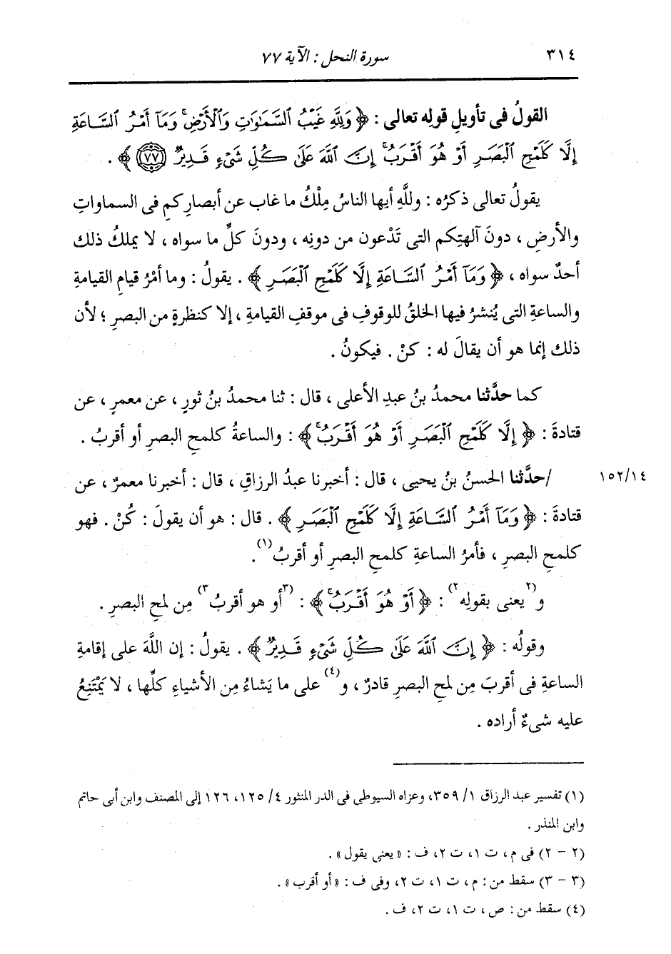 حَدَّثَنَا مُحَمَّدُ بْنُ عَبْدِ الْأَعْلَى، قَالَ: ثنا مُحَمَّدُ بْنُ ثَوْرٍ، عَنْ مَعْمَرٍ، عَنْ قَتَادَةَ: {§إِلَّا كَلَمْحِ الْبَصَرِ أَوْ هُوَ أَقْرَبُ} [النحل: 77] «وَالسَّاعَةُ كَلَمْحِ الْبَصَرِ، أَوْ أَقْرَبُ»