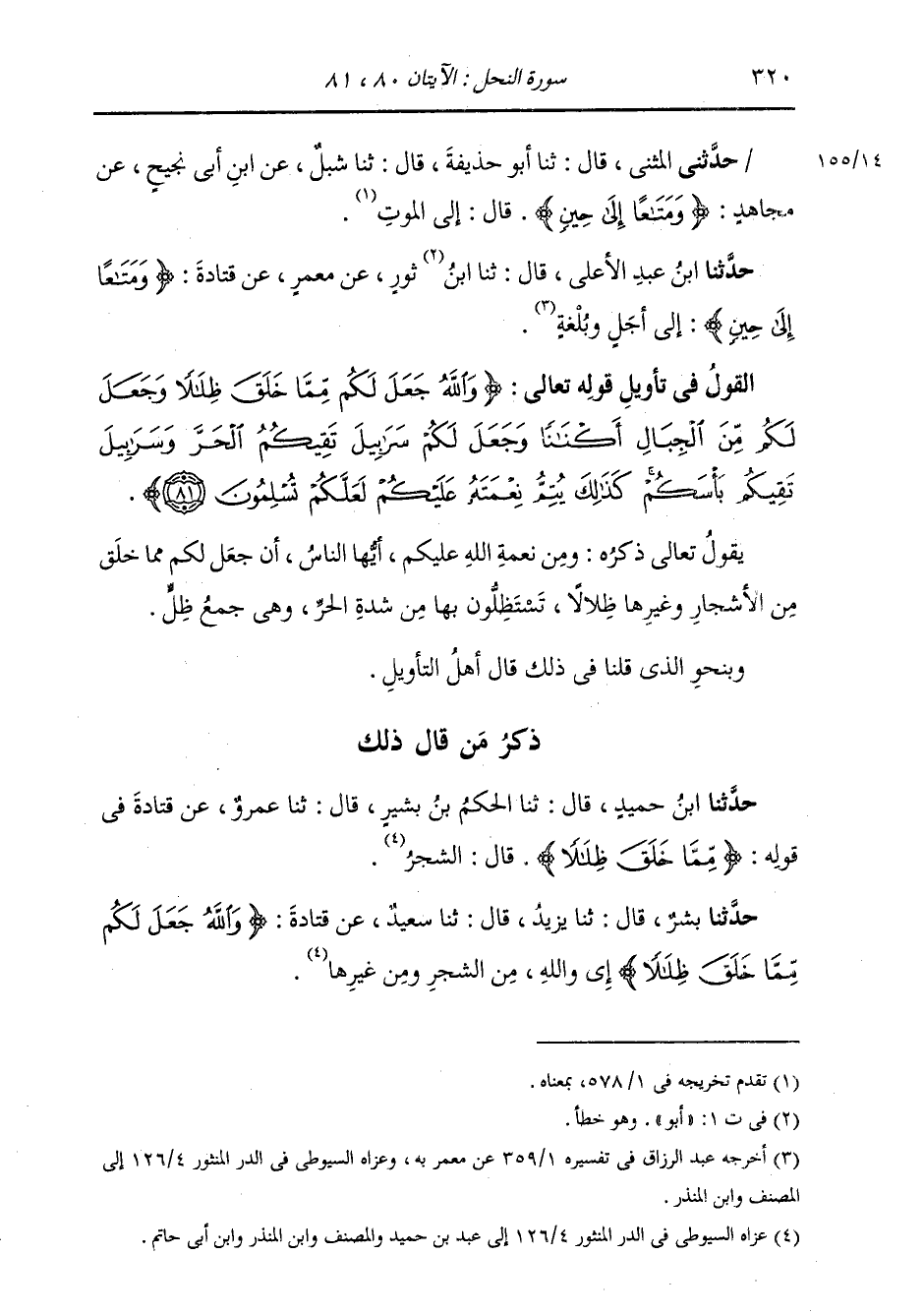 §الْقَوْلُ فِي تَأْوِيلِ قَوْلِهِ تَعَالَى: {وَاللَّهُ جَعَلَ لَكُمْ مِمَّا خَلَقَ ظِلَالًا وَجَعَلَ لَكُمْ مِنَ الْجِبَالِ أَكْنَانًا وَجَعَلَ لَكُمْ سَرَابِيلَ تَقِيكُمُ الْحَرَّ وَسَرَابِيلَ تَقِيكُمْ بَأْسَكُمْ، كَذَلِكَ يُتِمُّ نِعْمَتَهُ عَلَيْكُمْ لَعَلَّكُمْ تُسْلِمُونَ} [النحل: 81] يَقُولُ تَعَالَى ذِكْرُهُ: وَمِنْ نِعْمَةِ اللَّهِ عَلَيْكُمْ أَيُّهَا النَّاسُ أَنْ جَعَلَ لَكُمْ مِمَّا خَلَقَ مِنَ الْأَشْجَارِ وَغَيْرِهَا ظِلَالًا تَسْتَظِلُّونَ بِهَا مِنْ شِدَّةِ الْحَرِّ، وَهِيَ جَمْعُ ظِلٍّ. وَبِنَحْوِ الَّذِي قُلْنَا فِي ذَلِكَ قَالَ أَهْلُ التَّأْوِيلِ