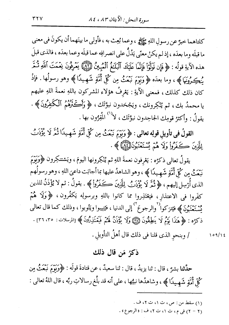 ذِكْرُ مَنْ قَالَ ذَلِكَ: حَدَّثَنَا بِشْرٌ، قَالَ: ثنا يَزِيدُ، قَالَ: ثنا سَعِيدٌ، عَنْ قَتَادَةَ، قَوْلُهُ: " {§وَيَوْمَ نَبْعَثُ مِنْ كُلِّ أُمَّةٍ شَهِيدًا} [النحل: 84] وَشَاهِدُهَا نَبِيُّهَا، عَلَى أَنَّهُ قَدْ بَلَّغَ رِسَالَاتِ رَبِّهِ، قَالَ اللَّهُ تَعَالَى -[328]-: {وَجِئْنَا بِكَ شَهِيدًا عَلَى هَؤُلَاءِ} [النحل: 89] "