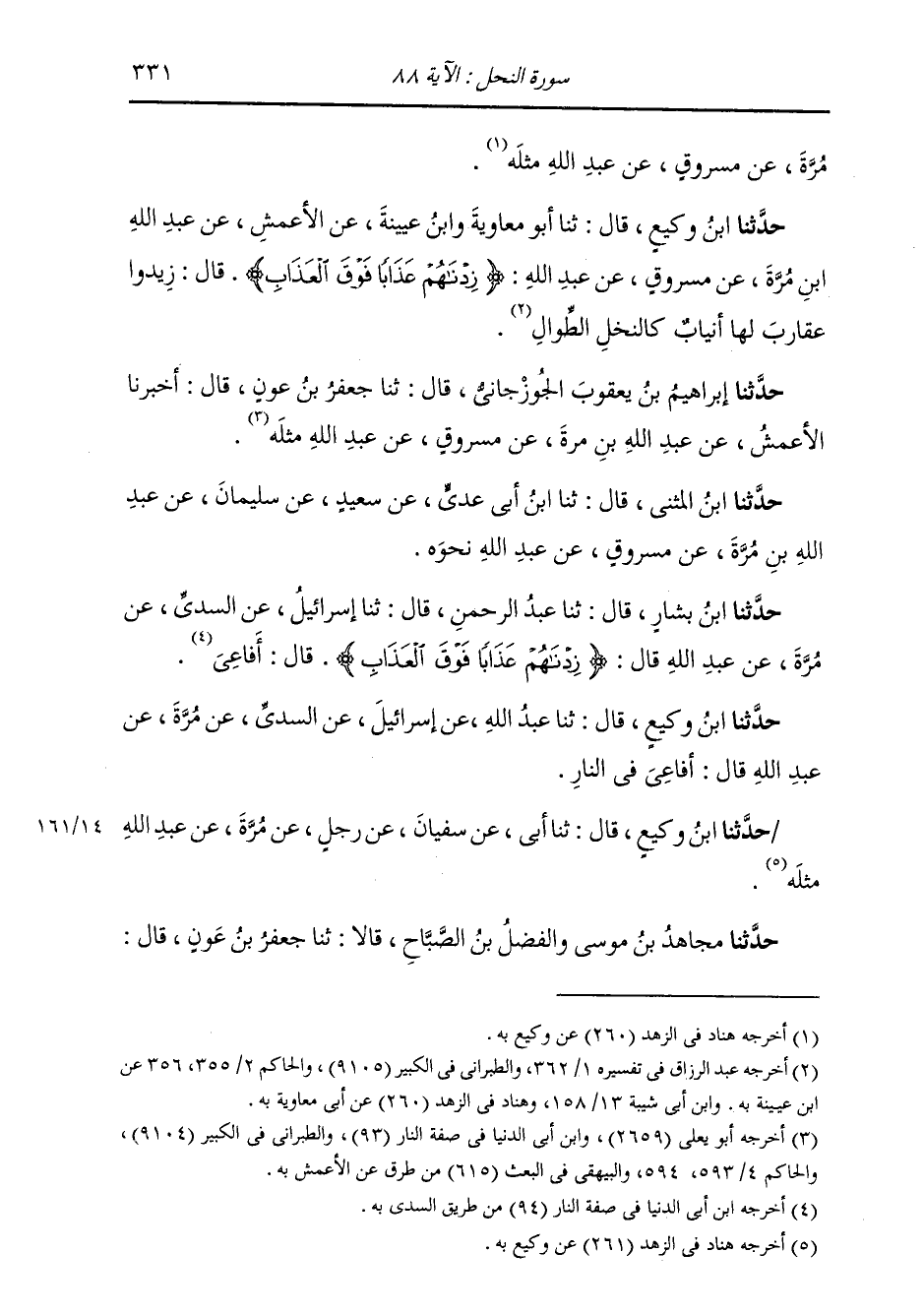 حَدَّثَنَا ابْنُ بَشَّارٍ، قَالَ: ثنا عَبْدُ الرَّحْمَنِ، قَالَ: ثنا إِسْرَائِيلُ، عَنِ السُّدِّيِّ، عَنْ مُرَّةَ، عَنْ عَبْدِ اللَّهِ، قَالَ: {§زِدْنَاهُمْ عَذَابًا فَوْقَ الْعَذَابِ} [النحل: 88] قَالَ: «أَفَاعِيَ»