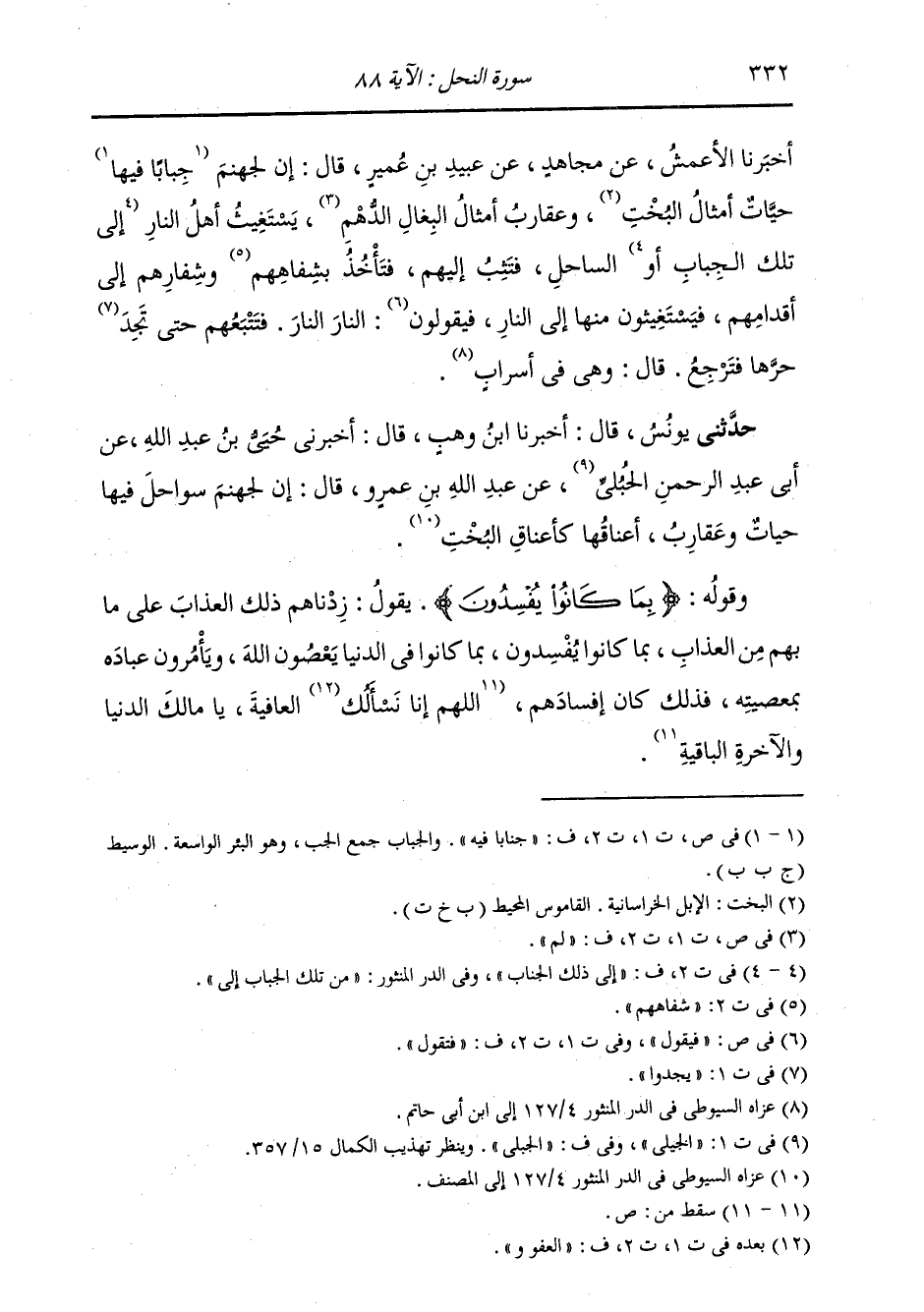 حَدَّثَنِي يُونُسُ، قَالَ: أَخْبَرَنَا ابْنُ وَهْبٍ، قَالَ: أَخْبَرَنِي حُيَيُّ بْنُ عَبْدِ اللَّهِ، عَنْ أَبِي عَبْدِ الرَّحْمَنِ الْحُبُلِيُّ، عَنْ عَبْدِ اللَّهِ بْنِ عَمْرٍو، قَالَ: «إِنَّ §لِجَهَنَّمَ سَوَاحِلَ فِيهَا حَيَّاتٌ وَعَقَارِبُ أَعْنَاقُهَا كَأَعْنَاقِ الْبُخْتِ»
