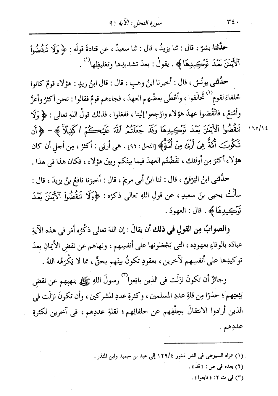 حَدَّثَنِي ابْنُ الْبَرْقِيِّ، قَالَ: ثنا ابْنُ أَبِي مَرْيَمَ، قَالَ: أَخْبَرَنَا نَافِعُ بْنُ يَزِيدَ، قَالَ: سَأَلْتُ يَحْيَى بْنَ سَعِيدٍ، عَنْ قَوْلِ اللَّهِ: {§وَلَا تَنْقُضُوا الْأَيْمَانَ بَعْدَ تَوْكِيدِهَا} [النحل: 91] قَالَ: «الْعُهُودُ» وَالصَّوَابُ مِنَ الْقَوْلِ فِي ذَلِكَ أَنْ يُقَالَ: إِنَّ اللَّهَ تَعَالَى أَمَرَ فِي هَذِهِ الْآيَةِ عِبَادَهُ بِالْوَفَاءِ بِعُهُودِهِ الَّتِي يَجْعَلُونَهَا عَلَى أَنْفُسِهِمْ، وَنَهَاهُمْ عَنْ نَقْضِ الْأَيْمَانِ بَعْدَ تَوْكِيدِهَا عَلَى أَنْفُسِهِمْ لِآخَرِينَ بِعُقُودٍ تَكُونُ بَيْنَهُمْ بِحَقٍّ مِمَّا لَا يَكْرَهُهُ اللَّهُ وَجَائِزٌ أَنْ تَكُونَ نَزَلَتْ فِي الَّذِينَ بَايَعُوا رَسُولَ اللَّهِ صَلَّى اللهُ عَلَيْهِ وَسَلَّمَ بِنَهْيِهِمْ عَنْ نَقْضِ بَيْعَتِهِمْ حَذَرًا مِنْ قِلَّةِ عَدَدِ الْمُسْلِمِينَ وَكَثْرَةِ عَدَدِ الْمُشْرِكِينَ، وَأَنْ تَكُونَ نَزَلَتْ فِي الَّذِينَ أَرَادُوا الِانْتِقَالَ بِحِلْفِهِمْ عَنْ حُلَفَائِهِمْ لِقِلَّةِ عَدَدِهِمْ فِي آخَرِينَ لِكَثْرَةِ عَدَدِهِمْ،