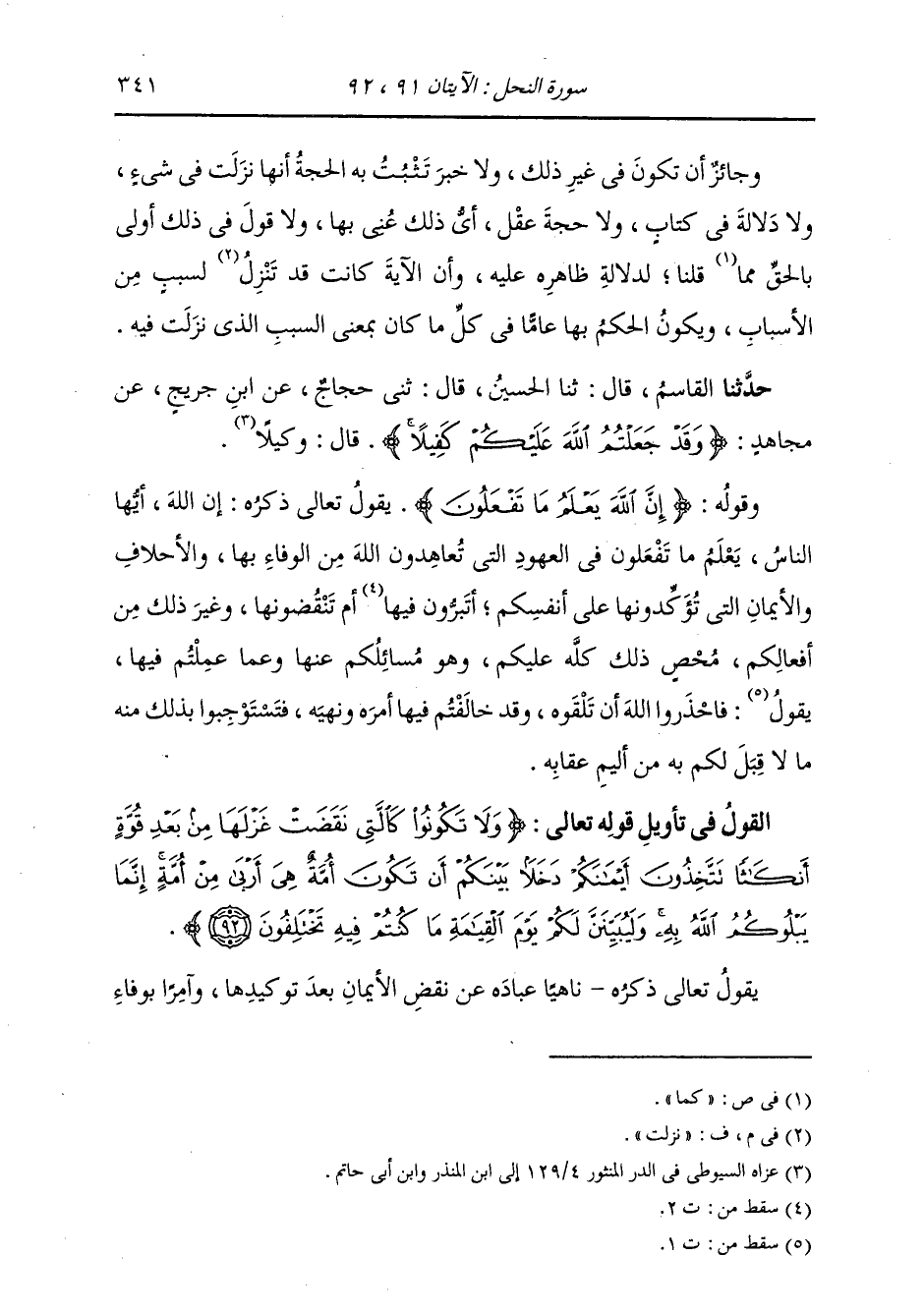 §الْقَوْلُ فِي تَأْوِيلِ قَوْلِهِ تَعَالَى: {وَلَا تَكُونُوا كَالَّتِي نَقَضَتْ غَزْلَهَا مِنْ بَعْدِ قُوَّةٍ أَنْكَاثًا، تَتَّخِذُونَ أَيْمَانَكُمْ دَخَلَا بَيْنَكُمْ، أَنْ تَكُونَ أُمَّةٌ هِيَ أَرْبَى مِنْ أُمَّةٍ، إِنَّمَا يَبْلُوكُمُ اللَّهُ بِهِ، وَلَيُبَيِّنَنَّ لَكُمْ يَوْمَ الْقِيَامَةِ مَا كُنْتُمْ فِيهِ تَخْتَلِفُونَ} [النحل: 92] يَقُولُ تَعَالَى ذِكْرُهُ نَاهِيًا عِبَادَهُ عَنْ نَقْضِ الْأَيْمَانِ بَعْدَ تَوْكِيدِهَا، وَآمِرًا بِوَفَاءِ -[342]- الْعُهُودِ، وَمُمَثِّلًا نَاقِضَ ذَلِكَ بِنَاقِضَةِ غَزْلِهَا مِنْ بَعْدَ إِبْرَامِهِ وَنَاكِثَتِهِ مِنْ بَعْدِ إِحْكَامِهِ: وَلَا تَكُونُوا أَيُّهَا النَّاسُ فِي نَقْضِكُمْ أَيْمَانَكُمْ بَعْدَ تَوْكِيدِهَا وَإِعْطَائِكُمُ اللَّهَ بِالْوَفَاءِ بِذَلِكَ الْعُهُودَ وَالْمَوَاثِيقَ {كَالَّتِي نَقَضَتْ غَزْلَهَا مِنْ بَعْدِ قُوَّةٍ} [النحل: 92] يَعْنِي: مِنْ بَعْدِ إِبْرَامٍ، وَكَانَ بَعْضُ أَهْلِ الْعَرَبِيَّةِ يَقُولُ: الْقُوَّةُ: مَا غُزِلَ عَلَى طَاقَةٍ وَاحِدَةٍ وَلَمْ يُثَنَّ، وَقِيلَ: إِنَّ الَّتِي كَانَتْ تَفْعَلُ ذَلِكَ امْرَأَةٌ حَمْقَاءُ مَعْرُوفَةٌ بِمَكَّةَ