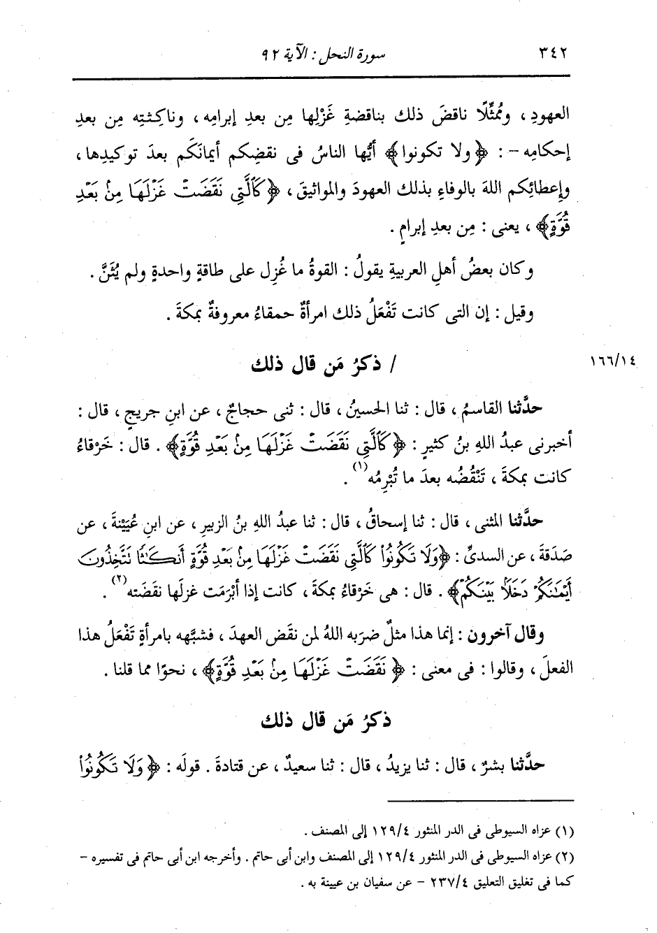 ذِكْرُ مَنْ قَالَ ذَلِكَ: حَدَّثَنَا بِشْرٌ، قَالَ: ثنا يَزِيدُ، قَالَ: ثنا سَعِيدٌ، عَنْ قَتَادَةَ، قَوْلُهُ: " {§وَلَا تَكُونُوا -[343]- كَالَّتِي نَقَضَتْ غَزْلَهَا مِنْ بَعْدِ قُوَّةٍ أَنْكَاثًا} [النحل: 92] فَلَوْ سَمِعْتُمْ بِامْرَأَةٍ نَقَضَتْ غَزْلَهَا مِنْ بَعْدِ إِبْرَامِهِ لَقُلْتُمْ: مَا أَحْمَقَ هَذِهِ وَهَذَا مَثَلٌ ضَرَبَهُ اللَّهُ لِمَنْ نَكَثَ عَهْدَهُ "
