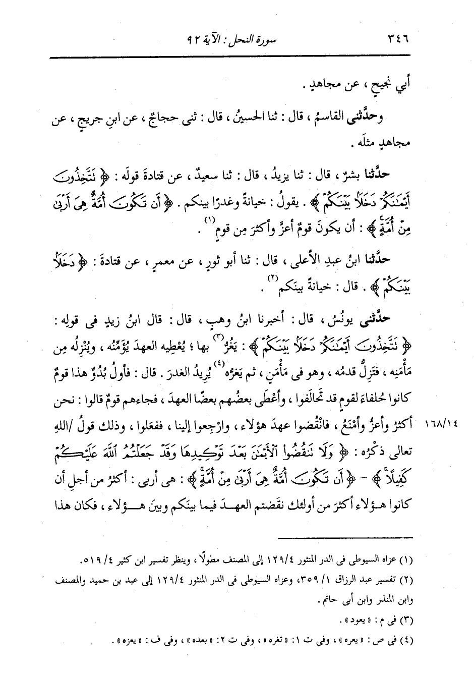 حَدَّثَنَا بِشْرٌ، قَالَ: ثنا يَزِيدُ، قَالَ: ثنا سَعِيدٌ، عَنْ قَتَادَةَ، قَوْلُهُ: " {§تَتَّخِذُونَ أَيْمَانَكُمْ دَخَلًا بَيْنَكُمْ} [النحل: 92] يَقُولُ: خِيَانَةً وَغَدْرًا بَيْنَكُمْ {أَنْ تَكُونَ أُمَّةٌ هِيَ أَرْبَى مِنْ أُمَّةٍ} [النحل: 92] أَنْ يَكُونَ قَوْمٌ أَعَزَّ وَأَكْثَرَ مِنْ قَوْمٍ "