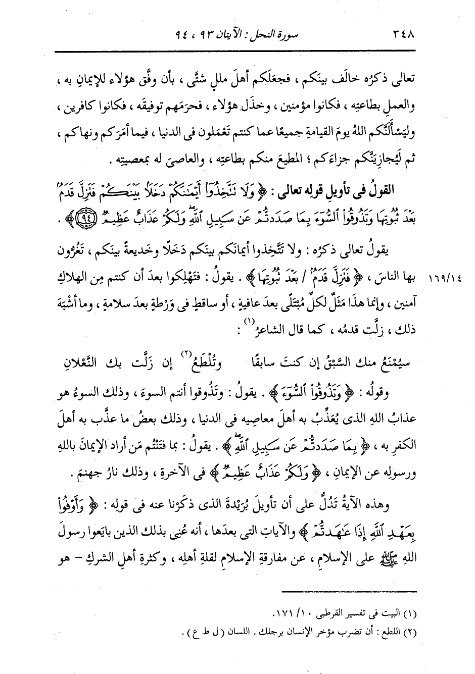 §الْقَوْلُ فِي تَأْوِيلِ قَوْلِهِ تَعَالَى: {وَلَا تَتَّخِذُوا أَيْمَانَكُمْ دَخَلًا بَيْنَكُمْ فَتَزِلَّ قَدَمٌ بَعْدَ ثُبُوتِهَا وَتَذُوقُوا الْسُّوءَ بِمَا صَدَدْتُمْ عَنْ سَبِيلِ اللَّهِ، وَلَكُمْ عَذَابٌ عَظِيمٌ} [النحل: 94] يَقُولُ تَعَالَى ذِكْرُهُ: وَلَا تَتَّخِذُوا أَيْمَانَكُمْ بَيْنَكُمْ دَخَلًا وَخَدِيعَةً بَيْنَكُمْ، تَغُرُّونَ بِهَا النَّاسَ {فَتَزِلَّ قَدَمٌ بَعْدَ ثُبُوتِهَا} [النحل: 94] يَقُولُ: فَتَهْلِكُوا بَعْدَ أَنْ كُنْتُمْ مِنَ الْهَلَاكِ آمِنِينَ وَإِنَّمَا هَذَا مَثَلٌ لِكُلِّ مُبْتَلًى بَعْدَ عَافِيَةٍ، أَوْ سَاقِطٍ فِي وَرْطَةٍ بَعْدِ سَلَامَةٍ، وَمَا أَشْبَهَ ذَلِكَ: «زَلَّتْ قَدَمُهُ» ، كَمَا قَالَ الشَّاعِرُ: