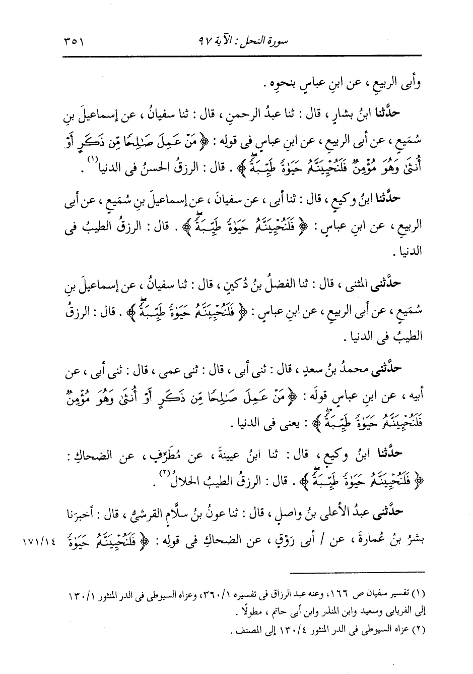 حَدَّثَنَا ابْنُ وَكِيعٍ، قَالَ: ثنا ابْنُ عُيَيْنَةَ، عَنْ مُطَرِّفٍ، عَنِ الضَّحَّاكِ: {§فَلَنُحْيِيَنَّهُ حَيَاةً طَيِّبَةً} [النحل: 97] قَالَ: «الرِّزْقُ الطَّيِّبُ الْحَلَالُ»