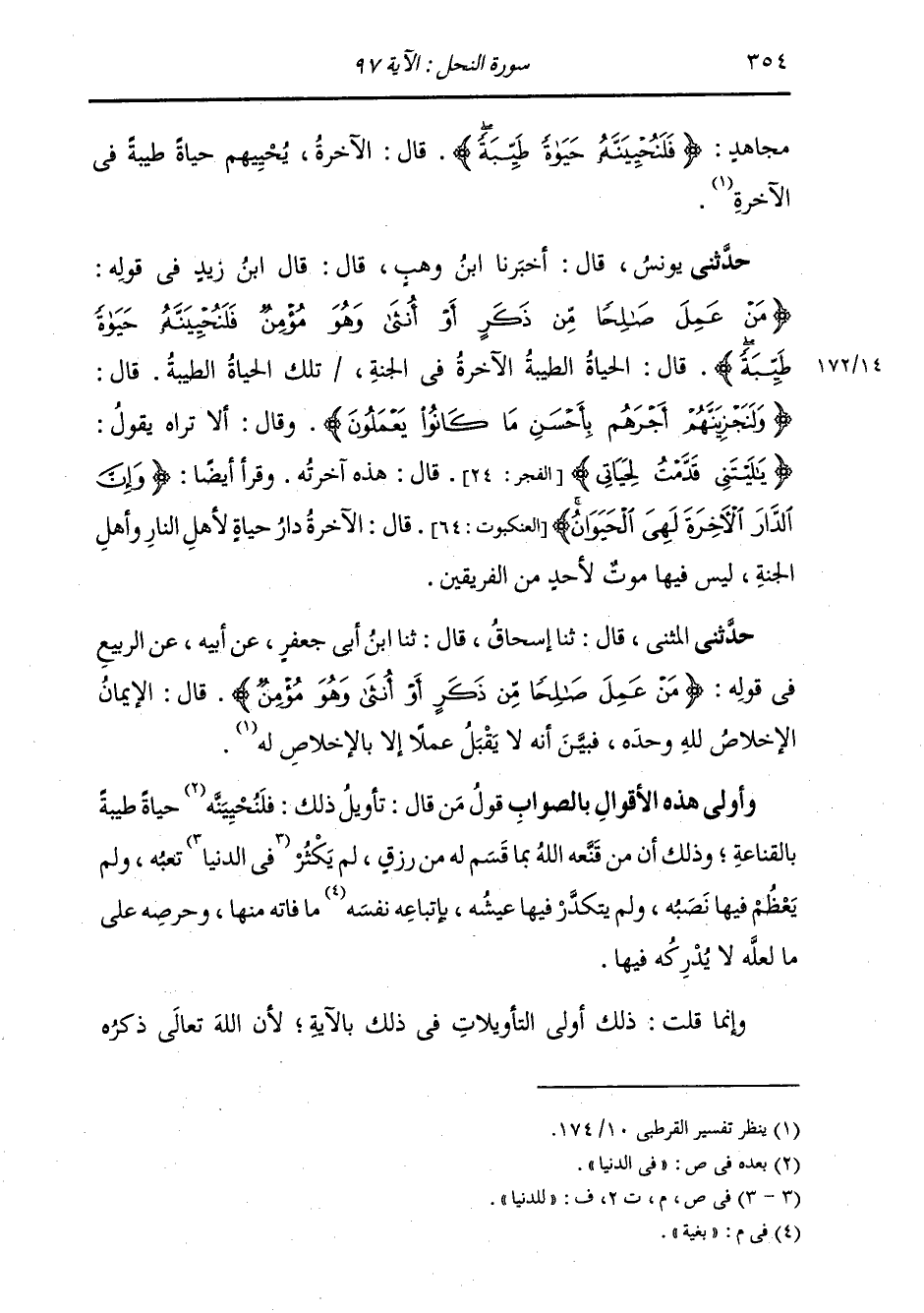 حَدَّثَنِي الْمُثَنَّى، قَالَ: ثنا إِسْحَاقُ، قَالَ: ثنا ابْنُ أَبِي جَعْفَرٍ، عَنْ أَبِيهِ، عَنِ الرَّبِيعِ، فِي قَوْلِهِ: {§مَنْ عَمِلَ صَالِحًا مِنْ ذَكَرٍ أَوْ أُنْثَى وَهُوَ مُؤْمِنٌ} [النحل: 97] قَالَ: " الْإِيمَانُ: الْإِخْلَاصُ للَّهِ وَحْدَهُ، فَبَيَّنَ أَنَّهُ لَا يَقْبَلُ عَمَلًا إِلَّا بِالْإِخْلَاصِ لَهُ " وَأَوْلَى الْأَقْوَالِ بِالصَّوَابِ قَوْلُ مَنْ قَالَ: تَأْوِيلُ ذَلِكَ: فَلَنُحْيِيَنَّهُ حَيَاةً طَيِّبَةً بِالْقَنَاعَةِ، وَذَلِكَ أَنَّ مَنْ قَنَّعَهُ اللَّهُ بِمَا قَسَمَ لَهُ مِنْ رِزْقٍ لَمْ يَكْثُرْ لِلدُّنْيَا تَعَبُهُ، وَلَمْ يَعْظُمْ فِيهَا نَصَبُهُ، وَلَمْ يَتَكَدَّرَ فِيهَا عَيْشُهُ بِاتِّبَاعِهِ بُغْيَةَ مَا فَاتَهُ، مِنْهَا وَحِرْصُهُ عَلَى مَا لَعَلَّهُ لَا يُدْرِكْهُ فِيهَا. وَإِنَّمَا قُلْتُ ذَلِكَ أَوْلَى التَّأْوِيلَاتِ فِي ذَلِكَ بِالْآيَةِ، لِأَنَّ اللَّهَ تَعَالَى ذِكْرُهُ
