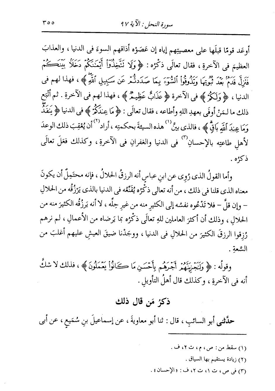 ذِكْرُ مَنْ قَالَ ذَلِكَ: حَدَّثَنِي أَبُو السَّائِبِ، قَالَ: ثنا أَبُو مُعَاوِيَةَ، عَنْ إِسْمَاعِيلَ بْنِ سُمَيْعٍ، عَنْ أَبِي -[356]- مَالِكٍ، عَنِ ابْنِ عَبَّاسٍ: {§وَلَنَجْزِيَنَّهُمْ أَجْرَهُمْ بِأَحْسَنِ مَا كَانُوا يَعْمَلُونَ} [النحل: 97] قَالَ: «إِذَا صَارُوا إِلَى اللَّهِ جَزَاهُمْ أَجْرَهُمْ بِأَحْسَنِ مَا كَانُوا يَعْمَلُونَ» . حَدَّثَنَا ابْنُ وَكِيعٍ قَالَ: ثنا أَبُو مُعَاوِيَةَ، عَنْ إِسْمَاعِيلَ بْنِ سُمَيْعٍ، عَنْ أَبِي مَالِكٍ، وَأَبِي الرَّبِيعِ، عَنِ ابْنِ عَبَّاسٍ، مِثْلَهُ