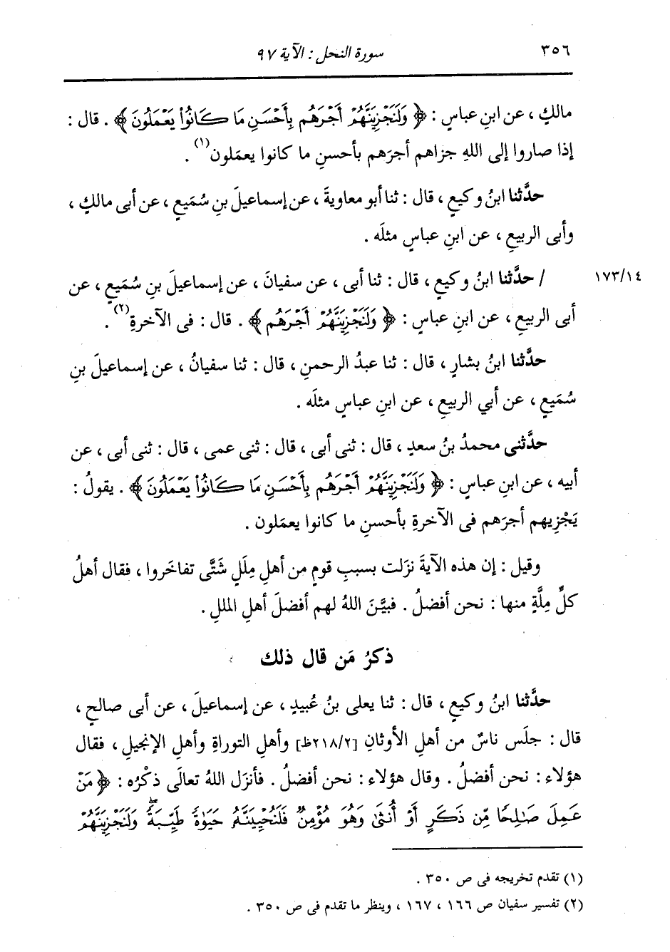 حَدَّثَنَا ابْنُ وَكِيعٍ، قَالَ: ثنا أَبِي، عَنْ سُفْيَانَ، عَنْ إِسْمَاعِيلَ بْنِ سُمَيْعٍ، عَنْ أَبِي الرَّبِيعِ، عَنِ ابْنِ عَبَّاسٍ: {§وَلَنَجْزِيَنَّهُمْ أَجْرَهُمْ} [النحل: 97] قَالَ: «فِي الْآخِرَةِ» . حَدَّثَنَا ابْنُ بَشَّارٍ قَالَ: ثنا عَبْدُ الرَّحْمَنِ، قَالَ: ثنا سُفْيَانُ، عَنْ إِسْمَاعِيلَ بْنِ سُمَيْعٍ، عَنْ أَبِي الرَّبِيعِ، عَنِ ابْنِ عَبَّاسٍ مِثْلَهُ