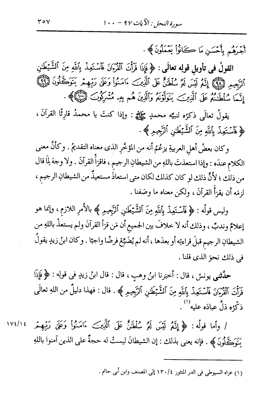 §الْقَوْلُ فِي تَأْوِيلِ قَوْلِهِ تَعَالَى: {فَإِذَا قَرَأْتَ الْقُرْآنَ فَاسْتَعِذْ بِاللَّهِ مِنَ الشَّيْطَانِ الرَّجِيمِ. إِنَّهُ لَيْسَ لَهُ سُلْطَانٌ عَلَى الَّذِينَ آمَنُوا وَعَلَى رَبِّهِمْ يَتَوَكَّلُونَ. إِنَّمَا سُلْطَانُهُ عَلَى الَّذِينَ يَتَوَلَّوْنَهُ وَالَّذِينَ هُمْ بِهِ مُشْرِكُونَ} [النحل: 99] يَقُولُ تَعَالَى ذِكْرُهُ لِنَبِيِّهِ مُحَمَّدٍ صَلَّى اللهُ عَلَيْهِ وَسَلَّمَ: وَإِذَا كُنْتَ يَا مُحَمَّدُ قَارِئًا الْقُرْآنَ، فَاسْتَعِذْ بِاللَّهِ مِنَ الشَّيْطَانِ الرَّجِيمِ وَكَانَ بَعْضُ أَهْلِ الْعَرَبِيَّةِ يَزْعُمُ أَنَّهُ مِنَ الْمُؤَخَّرِ الَّذِي مَعْنَاهُ التَّقْدِيمُ، وَكَأنَّ مَعْنَى الْكَلَامِ عِنْدَهُ: وَإِذَا اسْتَعَذْتَ بِاللَّهِ مِنَ الشَّيْطَانِ الرَّجِيمِ فَاقْرَأِ الْقُرْآنَ، وَلَا وَجْهَ لِمَا قَالَ مِنْ ذَلِكَ، لِأَنَّ ذَلِكَ لَوْ كَانَ كَذَلِكَ لَكَانَ مَتَى اسْتَعَاذَ مُسْتَعِيذٌ مِنَ الشَّيْطَانِ الرَّجِيمِ لَزِمَهُ أَنْ يَقْرَأَ الْقُرْآنَ، وَلَكِنَّ مَعْنَاهُ مَا وَصَفْنَاهُ، وَلَيْسَ قَوْلُهُ: {فَاسْتَعِذْ بِاللَّهِ مِنَ الشَّيْطَانِ الرَّجِيمِ} [النحل: 98] بِالْأَمْرِ اللَّازِمِ، وَإِنَّمَا هُوَ إِعْلَامٌ وَنَدْبٌ، وَذَلِكَ أَنَّهُ لَا خِلَافَ بَيْنَ الْجَمِيعِ أَنَّ مَنْ قَرَأَ الْقُرْآنَ وَلَمْ يَسْتَعِذْ بِاللَّهِ مِنَ الشَّيْطَانِ الرَّجِيمِ قَبْلَ قِرَاءَتِهِ أَوْ بَعْدَهَا أَنَّهُ لَمْ يُضَيِّعْ فَرْضًا وَاجِبًا. وَكَانَ ابْنُ زَيْدٍ يَقُولُ فِي ذَلِكَ نَحْوَ الَّذِي قُلْنَا