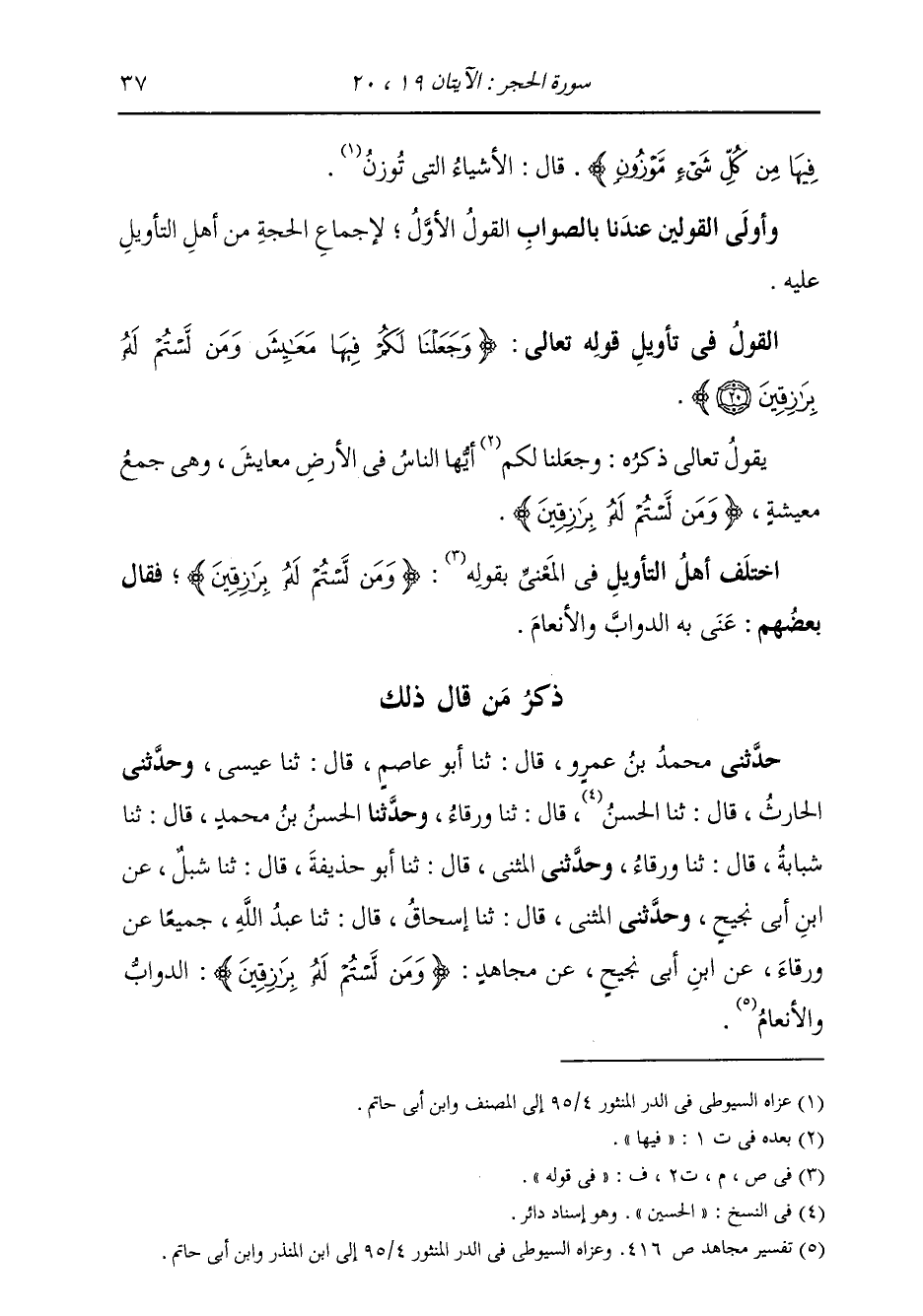 ذِكْرُ مَنْ قَالَ ذَلِكَ: حَدَّثَنِي مُحَمَّدُ بْنُ عَمْرٍو، قَالَ: ثنا أَبُو عَاصِمٍ، قَالَ: ثنا عِيسَى، وَحَدَّثَنِي الْحَرْثُ، قَالَ: ثنا الْحُسَيْنُ، قَالَ: ثنا وَرْقَاءُ، وَحَدَّثَنَا الْحَسَنُ بْنُ مُحَمَّدٍ، قَالَ: ثنا شَبَابَةُ، قَالَ: ثنا وَرْقَاءُ، وَحَدَّثَنِي الْمُثَنَّى، قَالَ: ثنا أَبُو حُذَيْفَةَ، قَالَ: ثنا شِبْلٌ، عَنِ ابْنِ أَبِي نَجِيحٍ، وَحَدَّثَنِي الْمُثَنَّى، قَالَ: ثنا إِسْحَاقُ، قَالَ: ثنا عَبْدُ اللَّهِ، جَمِيعًا، عَنْ وَرْقَاءَ، عَنِ ابْنِ أَبِي نَجِيحٍ، عَنْ مُجَاهِدٍ: " {§وَمَنْ لَسْتُمْ لَهُ بِرَازِقِينَ} [الحجر: 20] الدَّوَابَّ وَالْأَنْعَامَ ". -[38]- حَدَّثَنَا الْقَاسِمُ قَالَ: ثنا الْحُسَيْنُ قَالَ: ثني حَجَّاجٌ، عَنِ ابْنِ جُرَيْجٍ، عَنْ مُجَاهِدٍ، مِثْلَهُ. وَقَالَ آخَرُونَ: عَنَى بِذَلِكَ الْوَحْشَ خَاصَّةً