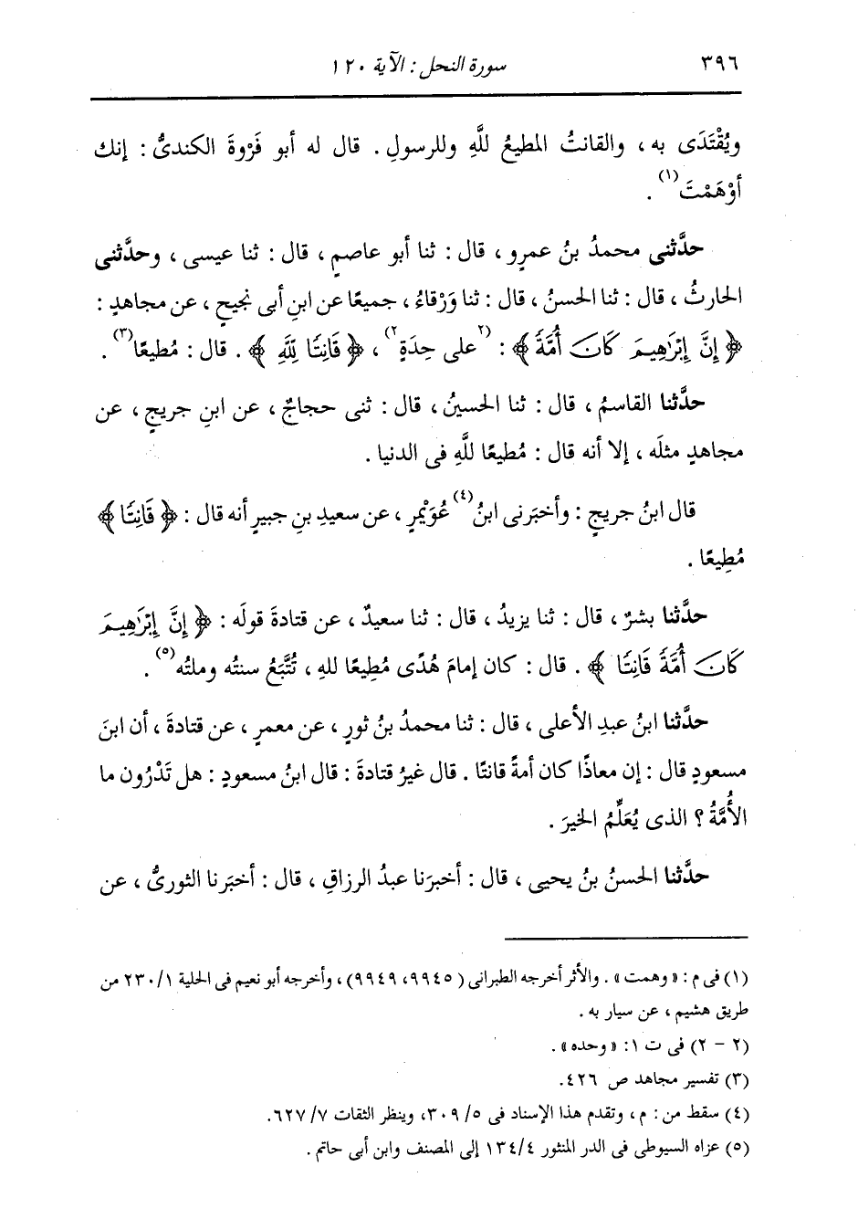 حَدَّثَنِي مُحَمَّدُ بْنُ عَمْرٍو، قَالَ: ثنا أَبُو عَاصِمٍ، قَالَ: ثنا عِيسَى، وَحَدَّثَنِي الْحَارِثُ، قَالَ: ثنا الْحَسَنُ، قَالَ: ثنا وَرْقَاءُ، جَمِيعًا، عَنِ ابْنِ أَبِي نَجِيحٍ، عَنْ مُجَاهِدٍ: " {§إِنَّ إِبْرَاهِيمَ كَانَ أُمَّةً} [النحل: 120] عَلَى حِدَةٍ، {قَانِتًا للَّهِ} [النحل: 120] ، قَالَ: مُطِيعًا ". حَدَّثَنَا الْقَاسِمُ قَالَ: ثنا الْحُسَيْنُ قَالَ: ثني حَجَّاجٌ، عَنِ ابْنِ جُرَيْجٍ، عَنْ مُجَاهِدٍ، مِثْلَهُ، إِلَّا أَنَّهُ، قَالَ: مُطِيعًا للَّهِ فِي الدُّنْيَا