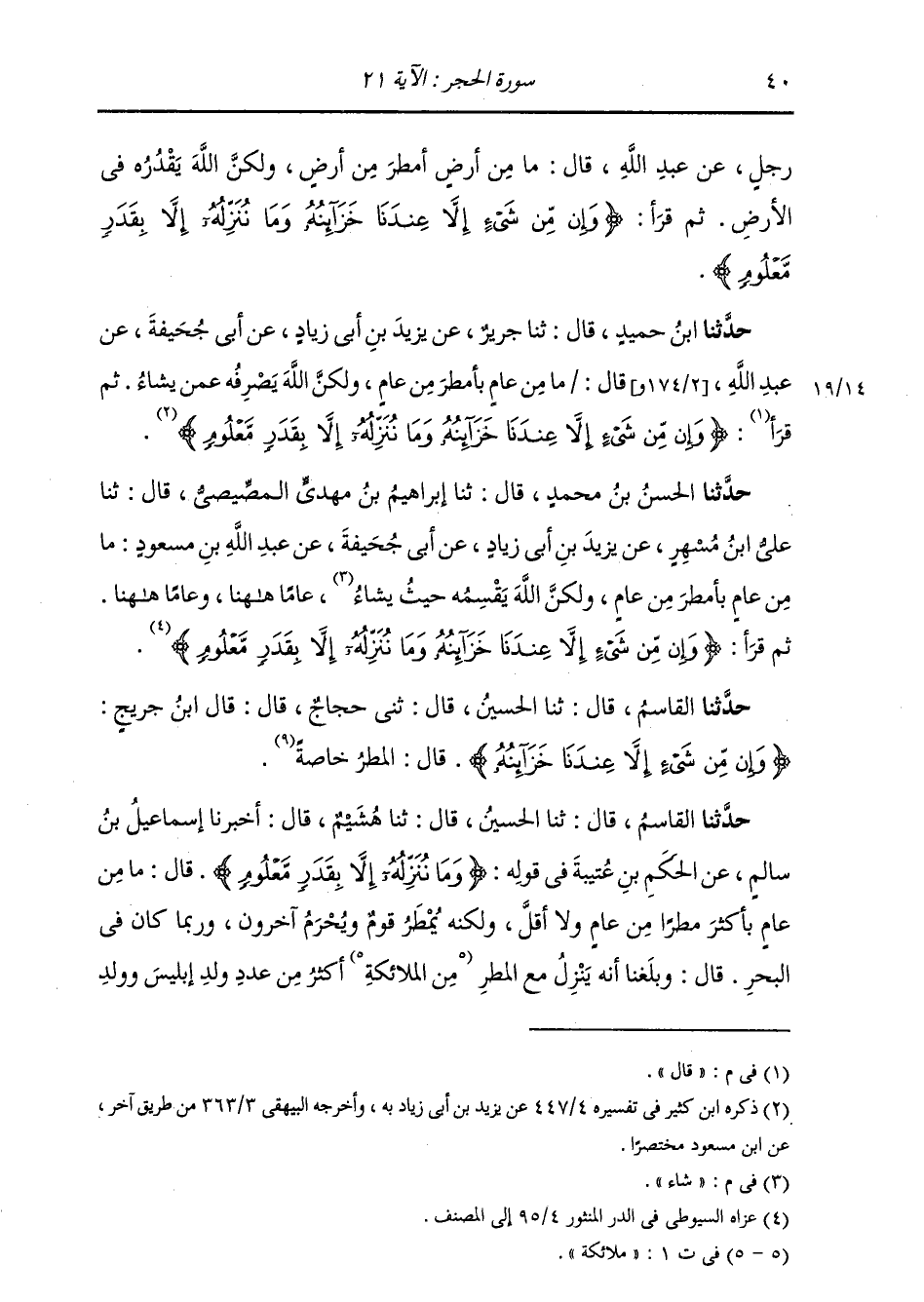 حَدَّثَنَا الْقَاسِمُ، قَالَ: ثنا الْحُسَيْنُ، قَالَ: ثنا هُشَيْمٌ، قَالَ: أَخْبَرَنَا إِسْمَاعِيلُ بْنُ سَالِمٍ، عَنِ الْحَكَمِ بْنِ عُتَيْبَةَ، فِي قَوْلِهِ: {§وَمَا نُنَزِّلُهُ إِلَّا بِقَدَرٍ مَعْلُومٍ} [الحجر: 21] قَالَ: " مَا مِنْ عَامٍ بِأَكْثَرَ مَطَرًا مِنْ عَامٍ وَلَا أَقَلَّ، وَلَكِنَّهُ يُمْطَرُ قَوْمٌ وَيُحْرَمُ آخَرُونَ، وَرُبَّمَا كَانَ فِي الْبَحْرِ قَالَ: وَبَلَغَنَا أَنَّهُ يَنْزِلُ مَعَ الْمَطَرِ مِنَ الْمَلَائِكَةِ أَكْثَرَ مِنْ عَدَدِ وَلَدِ إِبْلِيسَ وَوَلَدِ -[41]- آدَمَ يُحْصُونَ كُلَّ قَطْرَةٍ حَيْثُ تَقَعُ، وَمَا تُنْبِتُ "