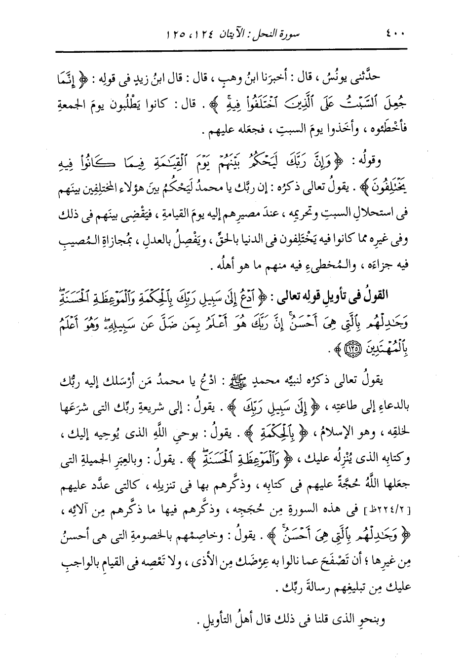 §الْقَوْلُ فِي تَأْوِيلِ قَوْلِهِ تَعَالَى: {ادْعُ إِلَى سَبِيلِ رَبِّكَ بِالْحِكْمَةِ وَالْمَوْعِظَةِ الْحَسَنَةِ، وَجَادِلْهُمْ بِالَّتِي هِيَ أَحْسَنُ، إِنَّ رَبَّكَ هُوَ أَعْلَمُ بِمَنْ ضَلَّ عَنْ سَبِيلِهِ، وَهُوَ أَعْلَمُ بِالْمُهْتَدِينَ} يَقُولُ تَعَالَى ذِكْرُهُ لِنَبِيِّهِ مُحَمَّدٍ صَلَّى اللهُ عَلَيْهِ وَسَلَّمَ: {ادْعُ} [البقرة: 68] يَا مُحَمَّدُ مَنْ أَرْسَلَكَ إِلَيْهِ رَبُّكَ بِالدُّعَاءِ إِلَى طَاعَتِهِ {إِلَى سَبِيلِ رَبِّكَ} [النحل: 125] يَقُولُ: إِلَى شَرِيعَةِ رَبِّكَ الَّتِي شَرَعَهَا لِخَلْقِهِ، وَهُوَ الْإِسْلَامُ {بِالْحِكْمَةِ} [النحل: 125] يَقُولُ بِوَحْيِ اللَّهِ الَّذِي يُوحِيهِ إِلَيْكَ وَكِتَابِهِ الَّذِي يُنْزِلُهُ عَلَيْكَ {وَالْمَوْعِظَةِ الْحَسَنَةِ} [النحل: 125] يَقُولُ: وَبِالْعِبَرِ الْجَمِيلَةِ الَّتِي جَعَلَهَا اللَّهُ حُجَّةً عَلَيْهِمْ فِي كِتَابِهِ، وَذَكَّرَهُمْ بِهَا فِي تَنْزِيلِهِ، كَالَّتِي عَدَّدَ عَلَيْهِمْ فِي هَذِهِ السُّورَةِ مِنْ حُجَجِهِ، وَذَكَّرَهُمْ فِيهَا مَا ذَكَّرَهُمْ مِنْ آلَائِهِ {وَجَادِلْهُمْ بِالَّتِي هِيَ أَحْسَنُ} [النحل: 125] يَقُولُ: وَخَاصِمْهُمْ بِالْخُصُومَةِ الَّتِي هِيَ أَحْسَنُ مِنْ غَيْرِهَا، أَنْ تَصْفَحَ عَمَّا نَالُوا بِهِ عِرْضِكَ مِنَ الْأَذَى، وَلَا تَعْصِهِ فِي الْقِيَامِ بِالْوَاجِبِ عَلَيْكَ مِنْ تَبْلِيغِهِمْ رِسَالَةَ رَبِّكَ. وَبِنَحْوِ الَّذِي قُلْنَا فِي ذَلِكَ قَالَ أَهْلُ التَّأْوِيلِ
