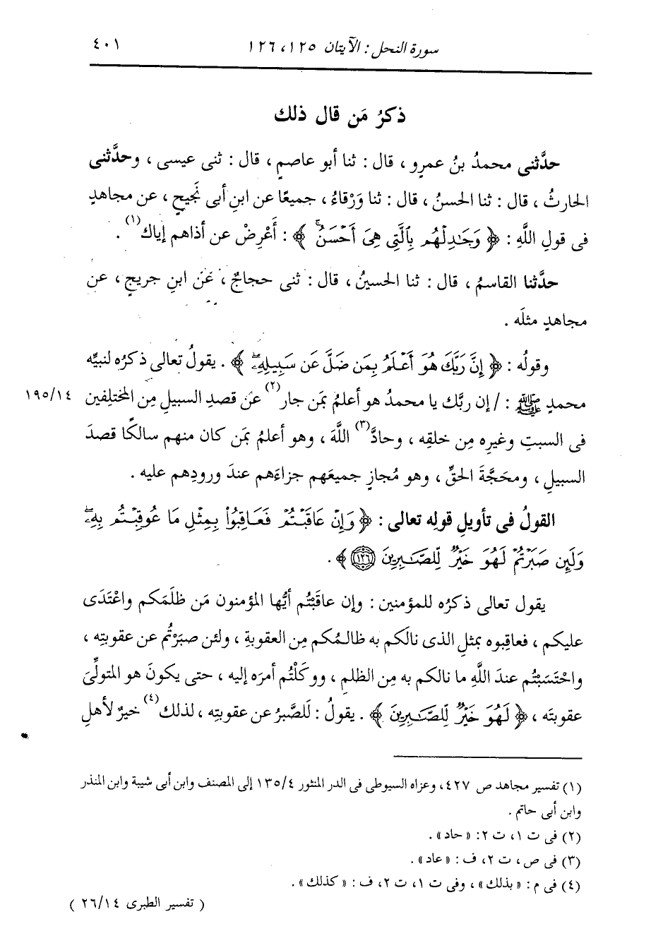§الْقَوْلُ فِي تَأْوِيلِ قَوْلِهِ تَعَالَى: {وَإِنْ عَاقَبْتُمْ فَعَاقِبُوا بِمِثْلِ مَا عُوقِبْتُمْ بِهِ، وَلَئِنْ صَبَرْتُمْ لَهُوَ خَيْرٌ لِلصَّابِرِينَ} [النحل: 126] يَقُولُ تَعَالَى ذِكْرُهُ لِلْمُؤْمِنِينَ: وَإِنْ عَاقَبْتُمْ أَيُّهَا الْمُؤْمِنُونَ مَنْ ظَلَمَكُمْ وَاعْتَدَى عَلَيْكُمْ، فَعَاقِبُوهُ بِمِثْلِ الَّذِي نَالَكُمْ بِهِ ظَالِمِكُمْ مِنَ الْعُقُوبَةِ، وَلَئِنْ صَبَرْتُمْ عَنْ عُقُوبَتِهِ وَاحْتَسَبْتُمْ عِنْدَ اللَّهِ مَا نَالَكُمْ بِهِ مِنَ الظُّلْمِ وَوَكَّلْتُمْ أَمْرَهُ إِلَيْهِ حَتَّى يَكُونَ هُوَ الْمُتَوَلِّي عُقُوبَتَهُ، {لَهُوَ خَيْرٌ لِلصَّابِرِينَ} [النحل: 126] يَقُولُ: لَلصَّبْرُ عَنْ عُقُوبَتِهِ بِذَلِكَ خَيْرٌ لِأَهْلِ