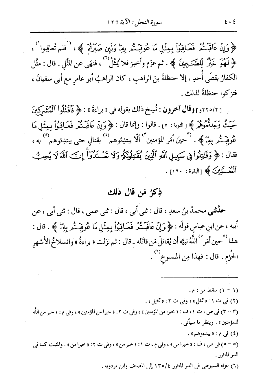 ذِكْرُ مَنْ قَالَ ذَلِكَ: حَدَّثَنِي مُحَمَّدُ بْنُ سَعْدٍ، قَالَ: ثني أَبِي قَالَ: ثني عَمِّي قَالَ: ثني أَبِي، عَنْ أَبِيهِ، عَنِ ابْنِ عَبَّاسٍ، قَوْلُهُ: {§وَإِنْ عَاقَبْتُمْ فَعَاقِبُوا بِمِثْلِ مَا عُوقِبْتُمْ بِهِ} [النحل: 126] قَالَ: " هَذَا خَبَرٌ مِنَ اللَّهِ نَبِيَّهُ أَنْ يُقَاتِلَ مَنْ قَاتَلَهُ، قَالَ: ثُمَّ نَزَلَتْ بَرَاءَةُ وَانْسِلَاخُ الْأَشْهُرِ الْحُرُمِ، قَالَ: فَهَذَا مِنَ الْمَنْسُوخِ ". -[405]- وَقَالَ آخَرُونَ: بَلْ عَنَى اللَّهُ تَعَالَى بِقَوْلِهِ: {وَاصْبِرْ وَمَا صَبْرُكَ إِلَّا بِاللَّهِ} [النحل: 127] نَبِيَّ اللَّهِ خَاصَّةً دُونَ سَائِرِ أَصْحَابِهِ، فَكَانَ الْأَمْرُ بِالصَّبْرِ لَهُ عَزِيمَةً مِنَ اللَّهِ دُونَهُمْ