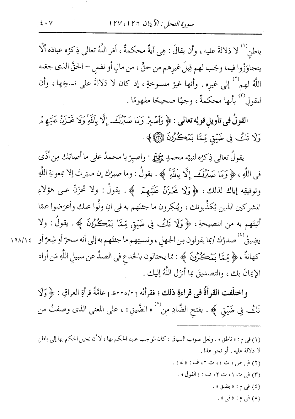 §الْقَوْلُ فِي تَأْوِيلِ قَوْلِهِ تَعَالَى: {وَاصْبِرْ وَمَا صَبْرُكَ إِلَّا بِاللَّهِ، وَلَا تَحْزَنْ عَلَيْهِمْ، وَلَا تَكُ فِي ضَيْقٍ مِمَّا يَمْكُرُونَ} [النحل: 127] يَقُولُ تَعَالَى ذِكْرُهُ لِنَبِيِّهِ مُحَمَّدٍ صَلَّى اللهُ عَلَيْهِ وَسَلَّمَ: وَاصْبِرْ يَا مُحَمَّدُ عَلَى مَا أَصَابَكَ مِنْ أَذًى فِي اللَّهِ {وَمَا صَبْرُكَ إِلَّا بِاللَّهِ} [النحل: 127] يَقُولُ: وَمَا صَبْرُكَ إِنْ صَبَرْتَ إِلَّا بِمَعُونَةِ اللَّهِ وَتَوْفِيقِهِ إِيَّاكَ لِذَلِكَ {وَلَا تَحْزَنْ عَلَيْهِمْ} [الحجر: 88] يَقُولُ: وَلَا تَحْزَنْ عَلَى هَؤُلَاءِ الْمُشْرِكِينَ الَّذِينَ يُكَذِّبُونَكَ وَيُنْكِرُونَ مَا جِئْتَهُمْ بِهِ فِي أَنْ وَلَّوْا عَنْكَ وَأَعْرَضُوا عَمَّا أَتَيْتَهُمْ بِهِ مِنَ النَّصِيحَةِ {وَلَا تَكُ فِي ضَيْقٍ مِمَّا يَمْكُرُونَ} [النحل: 127] يَقُولُ: وَلَا يَضِقْ صَدْرُكَ بِمَا يَقُولُونَ مِنَ الْجَهْلِ وَنِسْبَتُهُمْ مَا جِئْتَهُمْ بِهِ إِلَى أَنَّهُ سِحْرٌ أَوْ شِعْرٌ أَوْ كَهَانَةٌ {مِمَّا يَمْكُرُونَ} [النحل: 127] مِمَّا يَحْتَالُونَ بِالْخِدَعِ فِي الصَّدِّ عَنْ سَبِيلِ اللَّهِ مَنْ أَرَادَ الْإِيمَانَ بِكَ وَالتَّصْدِيقَ بِمَا أَنْزَلَ اللَّهُ إِلَيْكَ. وَاخْتَلَفَتِ الْقُرَّاءُ فِي قِرَاءَةِ ذَلِكَ، فَقَرَأَتْهُ عَامَّةُ قُرَّاءِ الْعِرَاقِ: {وَلَا تَكُ فِي ضَيْقٍ} [النحل: 127] بِفَتْحِ الضَّادِ فِي الضَّيْقِ عَلَى الْمَعْنَى الَّذِي وَصَفْتُ مِنْ