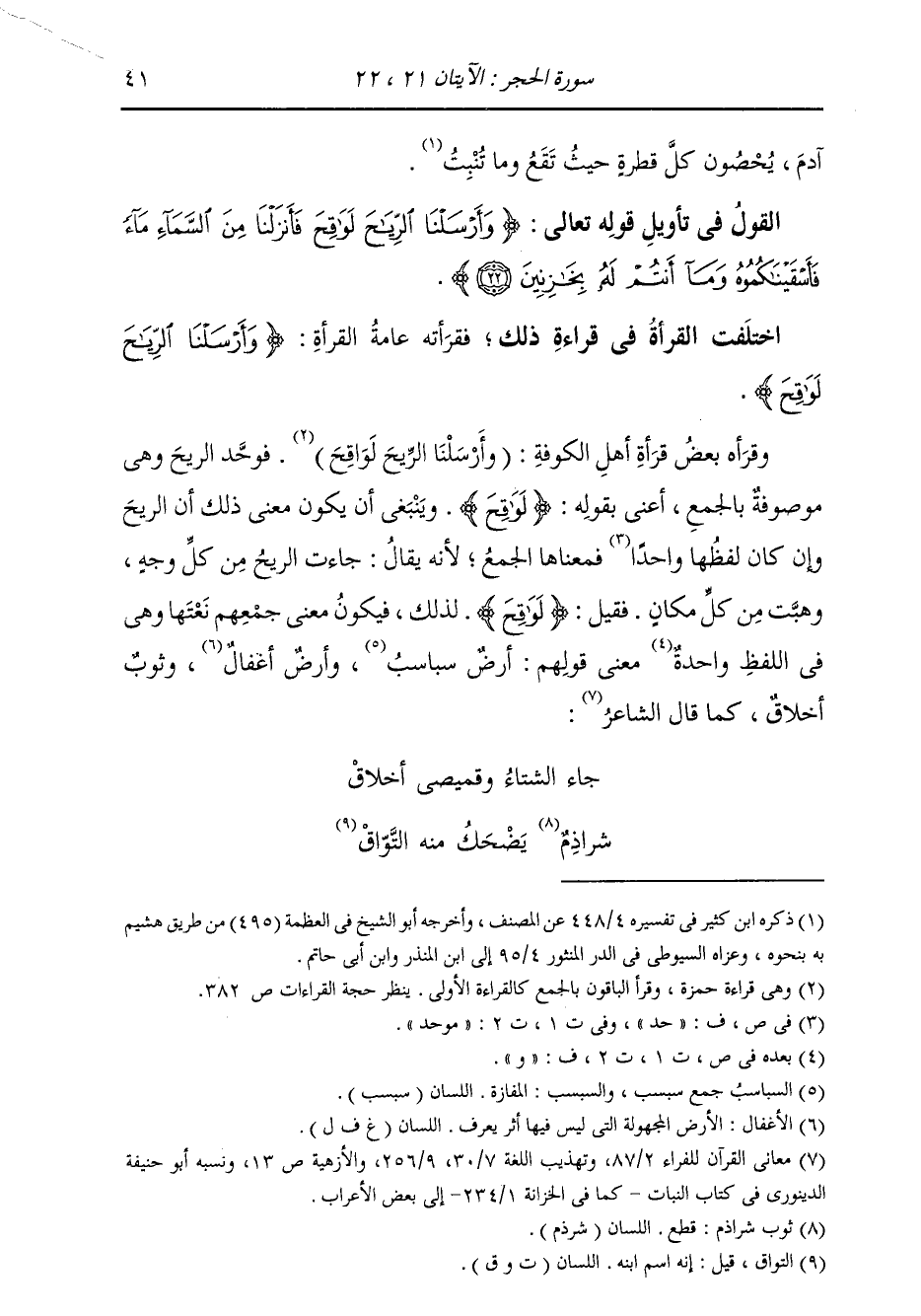 §الْقَوْلُ فِي تَأْوِيلِ قَوْلِهِ تَعَالَى: {وَأَرْسَلْنَا الرِّيَاحَ لَوَاقِحَ، فَأَنْزَلْنَا مِنَ السَّمَاءِ مَاءً فَأَسْقَيْنَاكُمُوهُ، وَمَا أَنْتُمْ لَهُ بِخَازِنِينَ} [الحجر: 22] اخْتَلَفَتِ الْقُرَّاءُ فِي قِرَاءَةِ ذَلِكَ، فَقَرَأَتْهُ عَامَّةُ الْقُرَّاءِ: {وَأَرْسَلْنَا الرِّيَاحَ لَوَاقِحَ} [الحجر: 22] وَقَرَأَهُ بَعْضُ قُرَّاءِ أَهْلِ الْكُوفَةِ: (وَأَرْسَلْنَا الرِّيحَ لَوَاقِحَ) " فَوَحَّدَ الرِّيحَ وَهِيَ مَوْصُوفَةٌ بِالْجَمْعِ، أَعْنِي بِقَوْلِهِ: «لَوَاقِحَ» وَيَنْبَغِي أَنْ يَكُونَ مَعْنَى ذَلِكَ: أَنَّ الرِّيحَ وَإِنْ كَانَ لَفْظُهَا وَاحِدًا، فَمَعْنَاهَا الْجَمْعُ، لِأَنَّهُ يُقَالُ: جَاءَتِ الرِّيحُ مِنْ كُلِّ وَجْهٍ، وَهَبَّتْ مِنْ كُلِّ مَكَانٍ، فَقِيلَ لَوَاقِحَ لِذَلِكَ، فَيَكُونُ مَعْنَى جَمْعِهِمْ نَعْتَهَا وَهِيَ فِي اللَّفْظِ وَاحِدَةٌ مَعْنَى قَوْلِهِمْ: أَرْضٌ سَبَاسِبُ، وَأَرْضُ أَغْفَالٍ، وَثَوْبٌ أَخْلَاقٌ، كَمَا قَالَ الشَّاعِرُ:
