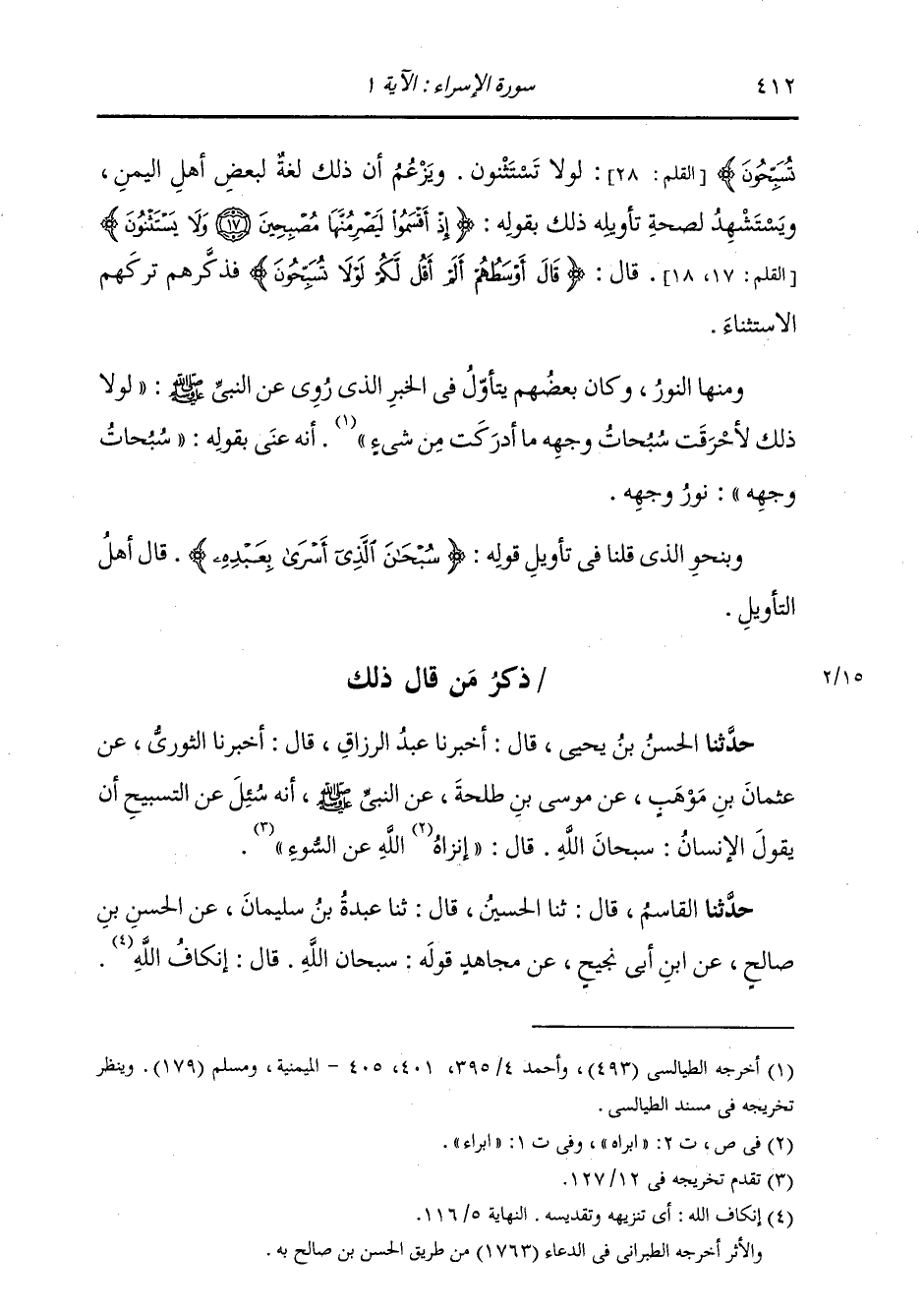 تُسَبِّحُونَ} [القلم: 28] لَوْلَا تَسْتَثْنُونَ، وَزَعَمَ أَنَّ ذَلِكَ لُغَةٌ لِبَعْضِ أَهْلِ الْيَمَنِ، وَيَسْتَشْهِدُ لِصِحَّةِ تَأْوِيلِهِ ذَلِكَ بِقَوْلِهِ: {إِذْ أَقْسَمُوا لَيَصْرِمُنَّهَا مُصْبِحِينَ وَلَا يَسْتَثْنُونَ} [القلم: 18] قَالَ: {قَالَ أَوْسَطُهُمْ أَلَمْ أَقُلْ لَكُمْ لَوْلَا تُسَبِّحُونَ} [القلم: 28] فَذِكْرُهُمْ تَرْكُهُمُ الِاسْتِثْنَاءَ. وَمِنْهَا النُّورُ، وَكَانَ بَعْضُهُمْ يَتَأَوَّلُ فِي الْخَبَرِ الَّذِي رُوِيَ عَنِ النَّبِيِّ صَلَّى اللهُ عَلَيْهِ وَسَلَّمَ: «لَوْلَا ذَلِكَ لَأَحْرَقَتْ سُبُحَاتُ وَجْهِهِ مَا أَدْرَكَتْ مِنْ شَيْءٍ» أَنَّهُ عَنَى بِقَوْلِهِ: سُبُحَاتُ وَجْهِهِ: نُورَ وَجْهِهِ. وَبِنَحْوِ الَّذِي قُلْنَا فِي تَأْوِيلِ قَوْلِهِ: {سُبْحَانَ الَّذِي أَسْرَى بِعَبْدِهِ} [الإسراء: 1] قَالَ أَهْلُ التَّأْوِيلِ