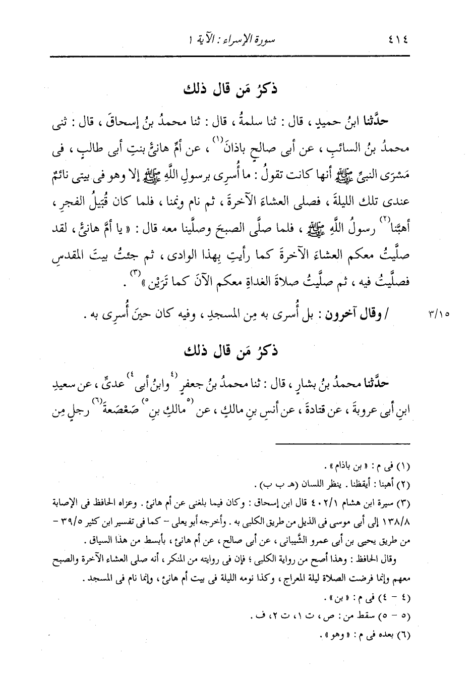 ذِكْرُ مَنْ قَالَ ذَلِكَ: حَدَّثَنَا ابْنُ حُمَيْدٍ، قَالَ: ثنا سَلَمَةُ، قَالَ: ثنا مُحَمَّدُ بْنُ إِسْحَاقَ، قَالَ: ثني مُحَمَّدُ بْنُ السَّائِبِ، عَنْ أَبِي صَالِحٍ بَاذَامَ، عَنْ أُمِّ هَانِئِ بِنْتِ أَبِي طَالِبٍ، فِي مَسْرَى النَّبِيِّ صَلَّى اللهُ عَلَيْهِ وَسَلَّمَ، أَنَّهَا كَانَتْ تَقُولُ: §مَا أُسْرِيَ بِرَسُولِ اللَّهِ صَلَّى اللهُ عَلَيْهِ وَسَلَّمَ إِلَّا وَهُوَ فِي بَيْتِي نَائِمٌ عِنْدِي تِلْكَ اللَّيْلَةَ، فَصَلَّى الْعِشَاءَ الْآخِرَةَ، ثُمَّ نَامَ وَنِمْنَا، فَلَمَّا كَانَ قُبَيْلَ الْفَجْرِ أَهَبَّنَا رَسُولُ اللَّهِ صَلَّى اللهُ عَلَيْهِ وَسَلَّمَ، فَلَمَّا صَلَّى الصُّبْحَ وَصَلَّيْنَا مَعَهُ قَالَ: «يَا أُمَّ هَانِئٍ لَقَدْ صَلَّيْتُ مَعَكُمُ الْعِشَاءَ الْآخِرَةَ كَمَا رَأَيْتِ بِهَذَا الْوَادِي، ثُمَّ جِئْتُ بَيْتَ الْمَقْدِسِ فَصَلَّيْتُ فِيهِ، ثُمَّ صَلَّيْتُ صَلَاةَ الْغَدَاةِ مَعَكُمُ الْآنَ كَمَا تَرَيْنَ» وَقَالَ آخَرُونَ: بَلْ أُسْرِيَ بِهِ مِنَ الْمَسْجِدِ، وَفِيهِ كَانَ حِينَ أُسْرِيَ بِهِ.