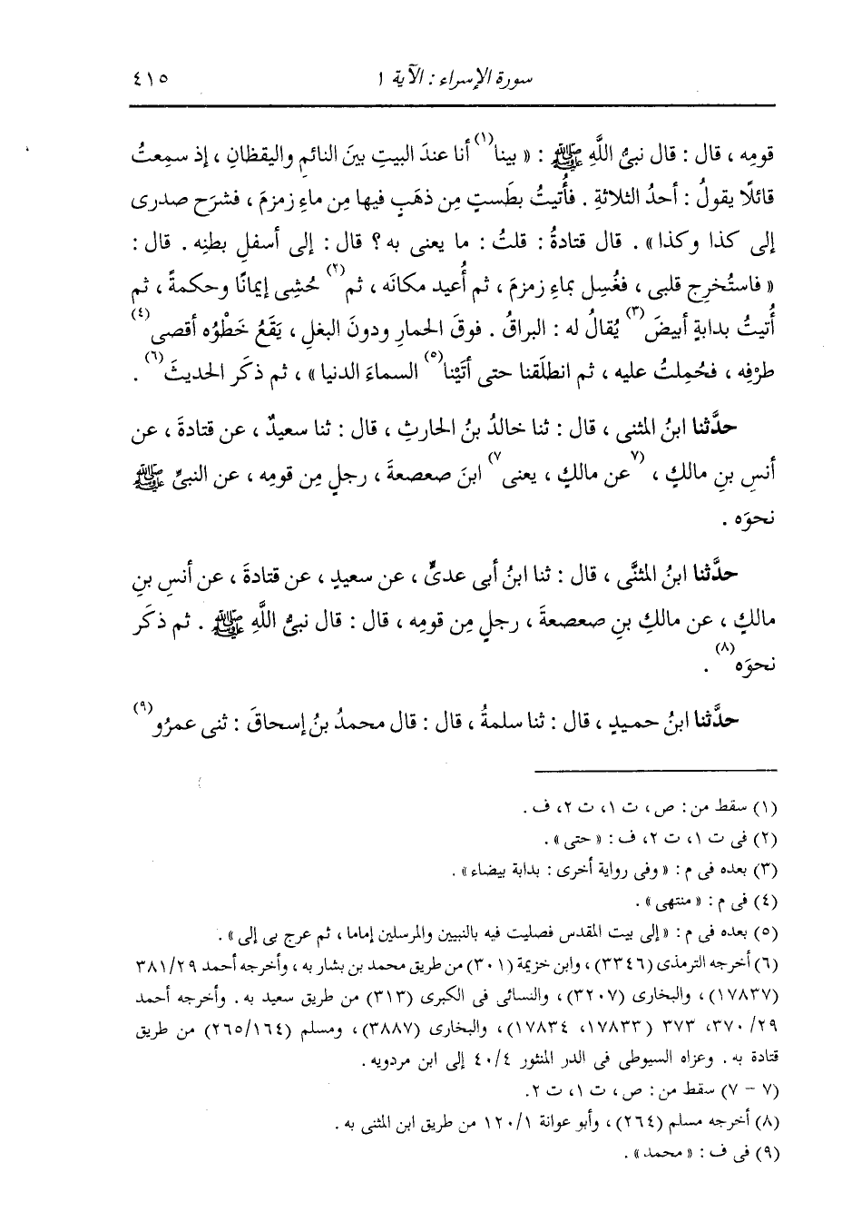 حَدَّثَنَا ابْنُ حُمَيْدٍ، قَالَ: ثنا سَلَمَةُ، قَالَ: قَالَ مُحَمَّدُ بْنُ إِسْحَاقَ: ثني عَمْرُو -[416]- بْنُ عَبْدِ الرَّحْمَنِ، عَنِ الْحَسَنِ بْنِ أَبِي الْحَسَنِ، قَالَ: قَالَ رَسُولُ اللَّهِ صَلَّى اللهُ عَلَيْهِ وَسَلَّمَ: «§بَيْنَا أَنَا نَائِمٌ فِي الْحِجْرِ جَاءَنِي جِبْرِيلُ فَهَمَزَنِي بِقَدَمِهِ، فَجَلَسْتُ فَلَمْ أَرَ شَيْئًا، فَعُدْتُ لِمَضْجَعِي، فَجَاءَنِي الثَّانِيَةَ فَهَمَزَنِي بِقَدَمِهِ، فَجَلَسْتُ فَلَمْ أَرَ شَيْئًا، فَعُدْتُ لِمَضْجَعِي، فَجَاءَنِي الثَّالِثَةَ فَهَمَزَنِي بِقَدَمِهِ، فَجَلَسْتُ فَأَخَذَ بِعَضُدِي فَقُمْتُ مَعَهُ، فَخَرَجَ بِي إِلَى بَابِ الْمَسْجِدِ، فَإِذَا دَابَّةٌ بَيْضَاءُ بَيْنَ الْحِمَارِ وَالْبَغْلِ، لَهُ فِي فَخِذَيْهِ جَنَاحَانِ يَحْفِزُ بِهِمَا رِجْلَيْهِ، يَضَعُ يَدَهُ فِي مُنْتَهَى طَرَفِهِ، فَحَمَلَنِي عَلَيْهِ ثُمَّ خَرَجَ مَعِي، لَا يَفُوتَنِي وَلَا أَفُوتُهُ»
