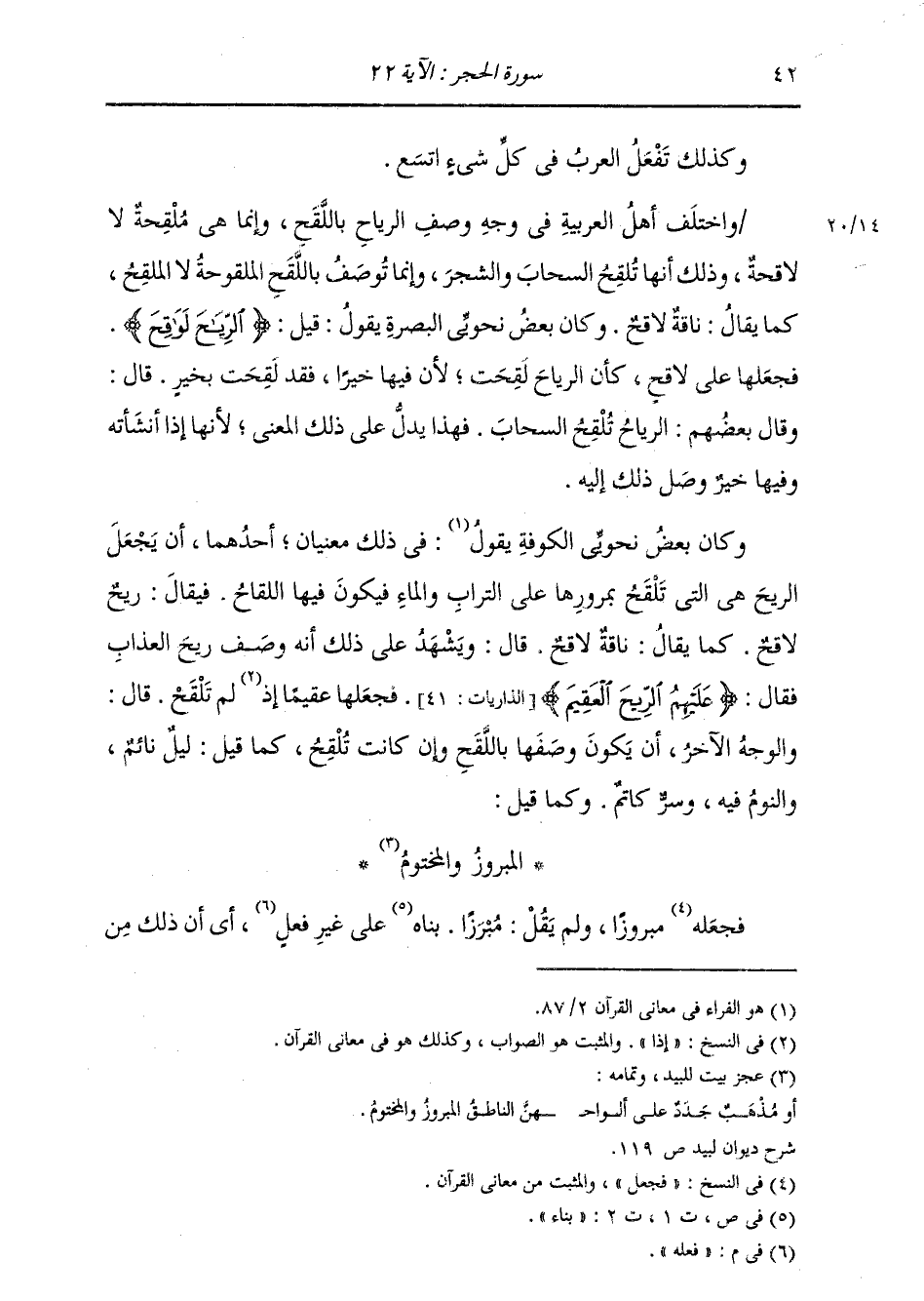 وَكَذَلِكَ تَفْعَلُ الْعَرَبُ فِي كُلِّ شَيْءٍ اتَّسَعَ. وَاخْتَلَفَ أَهْلُ الْعَرَبِيَّةِ فِي وَجْهِ وَصْفِ الرِّيَاحِ بِاللَّقْحِ، وَإِنَّمَا هِيَ مُلْقِحَةٌ لَا لَاقِحَةٌ، وَذَلِكَ أَنَّهَا تُلْقِحُ السَّحَابَ وَالشَّجَرَ، وَإِنَّمَا تُوصَفُ بِاللَّقْحِ الْمَلْقُوحَةُ لَا الْمُلْقِحُ، كَمَا يُقَالُ: نَاقَةٌ لَاقِحٌ، وَكَانَ بَعْضُ نَحْوِيِّي الْبَصْرَةِ يَقُولُ: قِيلَ: الرِّيَاحُ لَوَاقِحُ، فَجَعَلَهَا عَلَى لَاقِحٍ، كَأَنَّ الرِّيَاحَ لَقِحَتْ، لِأَنَّ فِيهَا خَيْرًا فَقَدْ لَقِحَتْ بِخَيْرٍ. قَالَ: وَقَالَ بَعْضُهُمُ: الرِّيَاحُ تُلْقِحُ السَّحَابَ، فَهَذَا يَدُلُّ عَلَى ذَلِكَ الْمَعْنَى، لِأَنَّهَا إِذَا أَنْشَأَتْهُ وَفِيهَا خَيْرٌ وَصَلَ ذَلِكَ إِلَيْهِ، وَكَانَ بَعْضُ نَحْوِيِّي الْكُوفَةِ يَقُولُ: فِي ذَلِكَ مَعْنَيَانِ: أَحَدُهُمَا أَنْ يَجْعَلَ الرِّيحَ هِيَ الَّتِي تُلْقِحُ بِمُرُورِهَا عَلَى التُّرَابِ وَالْمَاءِ فَيَكُونُ فِيهَا اللِّقَاحُ، فَيُقَالُ: رِيحٌ لَاقِحٌ، كَمَا يُقَالُ: نَاقَةٌ لَاقِحٌ، قَالَ: وَيَشْهَدُ عَلَى ذَلِكَ أَنَّهُ وَصَفَ رِيحَ الْعَذَابِ فَقَالَ: {عَلَيْهِمُ الرِّيحَ الْعَقِيمَ} [الذاريات: 41] فَجَعَلَهَا عَقِيمًا إِذَا لَمْ تُلْقِحْ. قَالَ: وَالْوَجْهُ الْآخَرُ أَنْ يَكُونَ وَصْفُهَا بِاللَّقْحِ وَإِنْ كَانَتْ تُلْقِحُ، كَمَا قِيلَ: لَيْلٌ نَائِمٌ، وَالنَّوْمُ فِيهِ، وَسِرٌّ كَاتِمٌ، وَكَمَا قِيلَ: الْمَبْرُوزُ وَالْمَخْتُومُ، فَجَعَلَ مَبْرُوزًا وَلَمْ يَقُلْ مُبْرَزًا بَنَاهُ عَلَى غَيْرِ فِعْلِهِ، أَيْ أَنَّ ذَلِكَ مِنْ