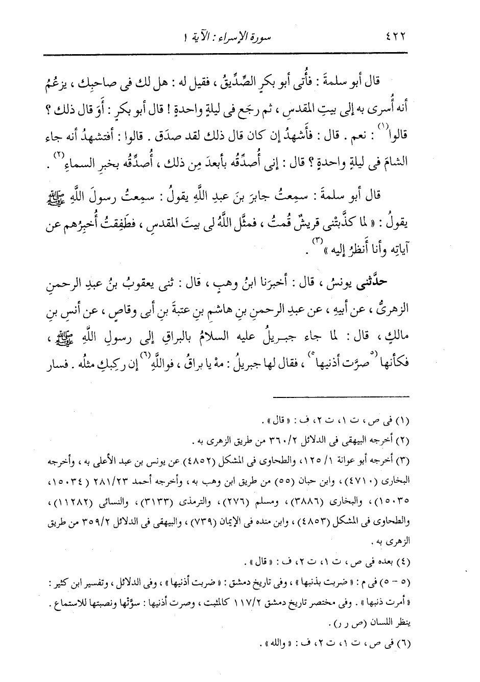 حَدَّثَنِي يُونُسُ، قَالَ: أَخْبَرَنَا ابْنُ وَهْبٍ، قَالَ: ثني يَعْقُوبُ بْنُ عَبْدِ الرَّحْمَنِ الزُّهْرِيُّ، عَنْ أَبِيهِ، عَنْ عَبْدِ الرَّحْمَنِ بْنِ هَاشِمِ بْنِ عُتْبَةَ بْنِ أَبِي وَقَّاصٍ، عَنْ أَنَسِ بْنِ مَالِكٍ، قَالَ: لَمَّا §جَاءَ جَبْرَائِيلُ عَلَيْهِ السَّلَامُ بِالْبُرَاقِ إِلَى رَسُولِ اللَّهِ صَلَّى اللهُ عَلَيْهِ وَسَلَّمَ، فَكَأَنَّهَا ضَرَبَتْ بَذَنَبِهَا، فَقَالَ لَهَا جِبْرَئِيلُ: مَهْ يَا بُرَاقُ، فَوَاللَّهِ إِنْ رَكِبَكَ مِثْلُهُ، فَسَارَ -[423]- رَسُولُ اللَّهِ صَلَّى اللهُ عَلَيْهِ وَسَلَّمَ، فَإِذَا هُوَ بِعَجُوزٍ نَاءَ عَنِ الطَّرِيقِ: أَيْ عَلَى جَنْبِ الطَّرِيقِ قَالَ أَبُو جَعْفَرٍ: يَنْبَغِي أَنْ يُقَالَ: نَائِيَةٍ، وَلَكِنْ أُسْقِطَ مِنْهَا التَّأْنِيثُ فَقَالَ: «مَا هَذِهِ يَا جَبْرَائِيلُ؟» قَالَ: سِرْ يَا مُحَمَّدُ، فَسَارَ مَا شَاءَ اللَّهُ أَنْ يَسِيرَ، فَإِذَا شَيْءٌ يَدْعُوهُ مُتَنَحِّيًا عَنِ الطَّرِيقِ يَقُولُ: هَلُمَّ يَا مُحَمَّدُ، قَالَ جَبْرَائِيلُ: سِرْ يَا مُحَمَّدُ، فَسَارَ مَا شَاءَ اللَّهُ أَنْ يَسِيرَ، قَالَ: ثُمَّ لَقِيَهُ خَلْقٌ مِنَ الْخَلَائِقِ، فَقَالَ أَحَدُهُمُ: السَّلَامُ عَلَيْكَ يَا أَوَّلُ، وَالسَّلَامُ عَلَيْكَ يَا آخِرُ، وَالسَّلَامُ عَلَيْكَ يَا حَاشِرُ، فَقَالَ لَهُ جَبْرَائِيلُ: ارْدُدِ السَّلَامَ يَا مُحَمَّدُ، قَالَ: فَرَدَّ السَّلَامَ، ثُمَّ لَقِيَهُ الثَّانِي، فَقَالَ لَهُ مِثْلَ مَقَالَةِ الْأَوَّلَيْنِ حَتَّى انْتَهَى إِلَى بَيْتِ الْمَقْدِسِ، فَعُرِضَ عَلَيْهِ الْمَاءُ وَاللَّبَنُ وَالْخَمْرُ، فَتَنَاوَلَ رَسُولُ اللَّهِ صَلَّى اللهُ عَلَيْهِ وَسَلَّمَ اللَّبَنَ، فَقَالَ لَهُ جَبْرَائِيلُ: أَصَبْتَ يَا مُحَمَّدُ الْفِطْرَةَ، وَلَوْ شَرِبْتَ الْمَاءَ لَغَرِقْتَ وَغَرِقَتْ أُمَّتُكَ، وَلَوْ شَرِبْتَ الْخَمْرَ لَغَوَيْتَ وَغَوَتْ أُمَّتُكَ. ثُمَّ بُعِثَ لَهُ آدَمُ فَمَنْ دُونَهُ مِنَ الْأَنْبِيَاءِ، فَأَمَّهُمْ رَسُولُ اللَّهِ صَلَّى اللهُ عَلَيْهِ وَسَلَّمَ تِلْكَ اللَّيْلَةَ، ثُمَّ قَالَ لَهُ جَبْرَائِيلُ: أَمَّا الْعَجُوزُ الَّتِي رَأَيْتَ عَلَى جَانِبِ الطَّرِيقِ، فَلَمْ يَبْقَ مِنَ الدُّنْيَا إِلَّا بِقَدْرِ مَا بَقِيَ مِنْ عُمْرِ تِلْكَ الْعَجُوزِ، وَأَمَّا الَّذِي أَرَادَ أَنْ تَمِيلَ إِلَيْهِ، فَذَاكَ عَدُوُّ اللَّهِ إِبْلِيسُ، أَرَادَ أَنْ تَمِيلَ إِلَيْهِ، وَأَمَّا الَّذِينَ سَلَّمُوا عَلَيْكَ، فَذَاكَ إِبْرَاهِيمُ وَمُوسَى وَعِيسَى