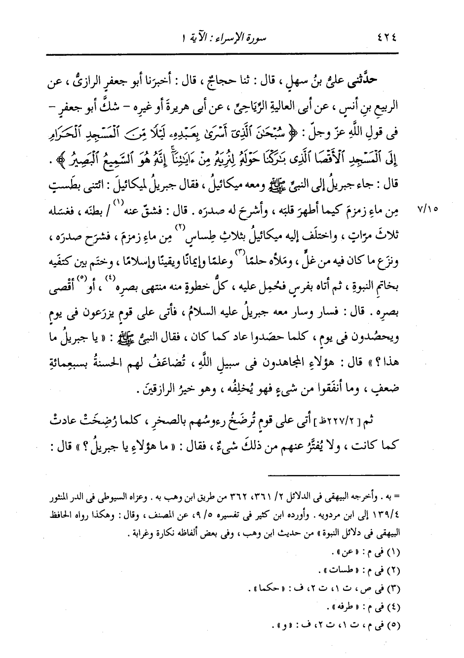 حَدَّثَنِي عَلِيُّ بْنُ سَهْلٍ، قَالَ: ثنا حَجَّاجٌ، قَالَ: أَخْبَرَنَا أَبُو جَعْفَرٍ الرَّازِيُّ، عَنِ الرَّبِيعِ بْنِ أَنَسٍ، عَنْ أَبِي الْعَالِيَةِ الرِّيَاحِيِّ، عَنْ أَبِي هُرَيْرَةَ، أَوْ غَيْرِهِ شَكَّ أَبُو جَعْفَرٍ فِي قَوْلِ اللَّهِ عَزَّ وَجَلَّ: {§سُبْحَانَ الَّذِي أَسْرَى بِعَبْدِهِ لَيْلًا مِنَ الْمَسْجِدِ الْحَرَامِ إِلَى الْمَسْجِدِ الْأَقْصَى الَّذِي بَارَكْنَا حَوْلَهُ لِنُرِيَهُ مِنْ آيَاتِنَا إِنَّهُ هُوَ السَّمِيعُ الْبَصِيرُ} [الإسراء: 1] قَالَ: جَاءُ جِبْرَائِيلُ إِلَى النَّبِيِّ صَلَّى اللهُ عَلَيْهِ وَسَلَّمَ وَمَعَهُ مِيكَائِيلُ، فَقَالَ جَبْرَائِيلُ لِمِيكَائِيلَ: ائْتِنِي بِطَسْتٍ مِنْ مَاءِ زَمْزَمَ كَيْمَا أُطَهِّرَ قَلْبَهُ وَأَشْرَحَ لَهُ صَدْرَهُ، قَالَ: فَشَقَّ عَنْ بَطْنِهِ، فَغَسَلَهُ ثَلَاثَ مَرَّاتٍ، وَاخْتَلَفَ إِلَيْهِ مِيكَائِيلُ بِثَلَاثِ طِسَاتٍ مِنْ مَاءِ زَمْزَمَ، فَشَرَحَ صَدْرَهُ، وَنَزَعَ مَا كَانَ فِيهِ مِنْ غِلٍّ، وَمَلَأَهُ حِلْمًا وَعِلْمًا وَإِيمَانًا وَيَقِينًا وَإِسْلَامًا، وَخَتَمَ بَيْنَ كَتِفَيْهِ بِخَاتَمِ النُّبُوَّةِ، ثُمَّ أَتَاهُ بِفَرَسٍ فَحُمِلَ عَلَيْهِ كُلُّ خُطْوَةٍ مِنْهُ مُنْتَهَى طَرَفِهِ وَأَقْصَى بَصَرِهِ قَالَ: فَسَارَ وَسَارَ مَعَهُ جَبْرَائِيلُ عَلَيْهِ السَّلَامُ، فَأَتَى عَلَى قَوْمٍ يَزْرَعُونَ فِي يَوْمٍ وَيَحْصُدُونَ فِي يَوْمٍ، كُلَّمَا حَصَدُوا عَادَ كَمَا كَانَ، فَقَالَ النَّبِيُّ صَلَّى اللهُ عَلَيْهِ وَسَلَّمَ: «يَا جَبْرَائِيلُ مَا هَذَا؟» قَالَ: هَؤُلَاءِ الْمُجَاهِدُونَ فِي سَبِيلِ اللَّهِ، تُضَاعَفُ لَهُمُ الْحَسَنَةُ بِسَبْعِ مِائَةِ ضِعْفٍ، وَمَا أَنْفَقُوا مِنْ شَيْءٍ فَهُوَ يَخْلُفُهُ وَهُوَ خَيْرُ الرَّازِقِينَ، ثُمَّ أَتَى عَلَى قَوْمٍ تُرْضَخُ رُءُوسُهُمْ بِالصَّخْرِ، كُلَّمَا رُضِخَتْ عَادَتْ كَمَا كَانَتْ، لَا يُفَتَّرُ عَنْهُمْ مِنْ ذَلِكَ شَيْءٌ، فَقَالَ: «مَا هَؤُلَاءِ يَا جَبْرَائِيلُ؟» قَالَ: -[425]- هَؤُلَاءِ الَّذِينَ تَتَثَاقَلُ رُءُوسُهُمْ عَنِ الصَّلَاةِ الْمَكْتُوبَةِ، ثُمَّ أَتَى عَلَى قَوْمٍ عَلَى أَقْبَالِهِمْ رِقَاعٌ، وَعَلَى أَدْبَارِهِمْ رِقَاعٌ، يَسْرَحُونَ كَمَا تَسْرَحُ الْإِبِلُ وَالْغَنَمُ، وَيَأْكُلُونَ الضَّرِيعَ وَالزَّقُّومَ وَرَضَفَ جَهَنَّمَ وَحِجَارَتَهَا، قَالَ: «مَا هَؤُلَاءِ يَا جَبْرَائِيلُ؟» قَالَ: هَؤُلَاءِ الَّذِينَ لَا يُؤَدُّونَ صَدَقَاتِ أَمْوَالِهِمْ، وَمَا ظَلَمَهُمُ اللَّهُ شَيْئًا، وَمَا اللَّهُ بِظَلَّامٍ لِلْعَبِيدِ، ثُمَّ أَتَى عَلَى قَوْمٍ بَيْنَ أَيْدِيهِمْ لَحْمٌ نَضِيجٌ فِي قُدُورٍ، وَلَحْمٌ آخَرُ نِيءٌ قَذِرٌ خَبِيثٌ، فَجَعَلُوا يَأْكُلُونَ مِنَ النِّيءِ، وَيَدَعُونَ النَّضِيجَ الطَّيِّبَ، فَقَالَ: «مَا هَؤُلَاءِ يَا جَبْرَئِيلُ؟» قَالَ: هَذَا الرَّجُلُ مِنْ أُمَّتِكَ، تَكُونُ عِنْدَهُ الْمَرْأَةُ الْحَلَالُ الطَّيِّبُ، فَيَأْتِي امْرَأَةً خَبِيثَةً فَيَبِيتُ عِنْدَهَا حَتَّى يُصْبِحَ، وَالْمَرْأَةُ تَقُومُ مِنْ عِنْدِ زَوْجِهَا حَلَالًا طَيِّبًا، فَتَأْتِي رَجُلًا خَبِيثًا، فَتَبِيتُ مَعَهُ حَتَّى تُصْبِحَ. قَالَ: ثُمَّ أَتَى عَلَى خَشَبَةٍ فِي الطَّرِيقِ لَا يَمُرُّ بِهَا ثَوْبٌ إِلَّا شَقَّتْهُ، وَلَا شَيْءٌ إِلَّا خَرَقَتْهُ، قَالَ: «مَا هَذَا يَا جَبْرَائِيلُ؟» قَالَ: هَذَا مَثَلُ أَقْوَامٍ مِنْ أُمَّتِكَ يَقْعُدُونَ عَلَى الطَّرِيقِ فَيَقْطَعُونَهُ. ثُمَّ قَرَأَ: {وَلَا تَقْعُدُوا بِكُلِّ صِرَاطٍ تُوعِدُونَ وَتَصَدُّونَ} [الأعراف: 86] الْآيَةَ ثُمَّ أَتَى عَلَى رَجُلٍ قَدْ جَمَعَ حُزْمَةَ حَطَبٍ عَظِيمَةً لَا يَسْتَطِيعُ حَمْلَهَا، وَهُوَ يَزِيدُ -[426]- عَلَيْهَا، فَقَالَ: «مَا هَذَا يَا جَبْرَائِ