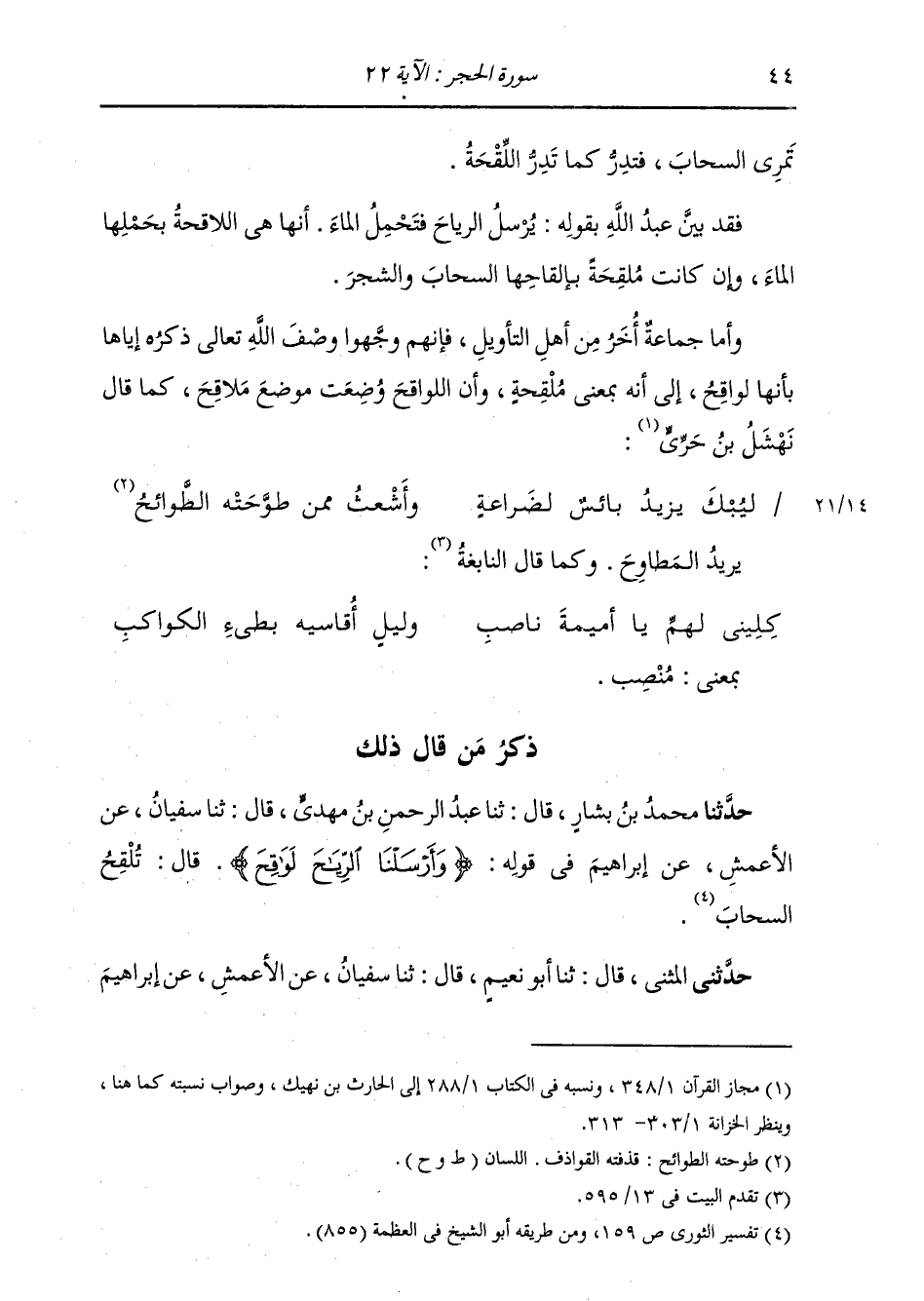 ذِكْرُ مَنْ قَالَ ذَلِكَ: حَدَّثَنَا مُحَمَّدُ بْنُ بَشَّارٍ، قَالَ: ثنا عَبْدُ الرَّحْمَنِ بْنُ مَهْدِيٍّ، قَالَ: ثنا سُفْيَانُ، عَنِ الْأَعْمَشِ، عَنْ إِبْرَاهِيمَ، فِي قَوْلِهِ: " {§وَأَرْسَلْنَا الرِّيَاحَ لَوَاقِحَ} [الحجر: 22] قَالَ: «تُلْقِحُ السَّحَابَ» . حَدَّثَنِي الْمُثَنَّى قَالَ: ثنا أَبُو نُعَيْمٍ قَالَ: ثنا سُفْيَانُ، عَنِ الْأَعْمَشِ، عَنْ إِبْرَاهِيمَ، -[45]- مِثْلَهُ. حَدَّثَنَا أَحْمَدُ بْنُ إِسْحَاقَ قَالَ: ثنا أَبُو أَحْمَدَ قَالَ: ثنا سُفْيَانُ، عَنِ الْأَعْمَشِ، عَنْ إِبْرَاهِيمَ، مِثْلَهُ