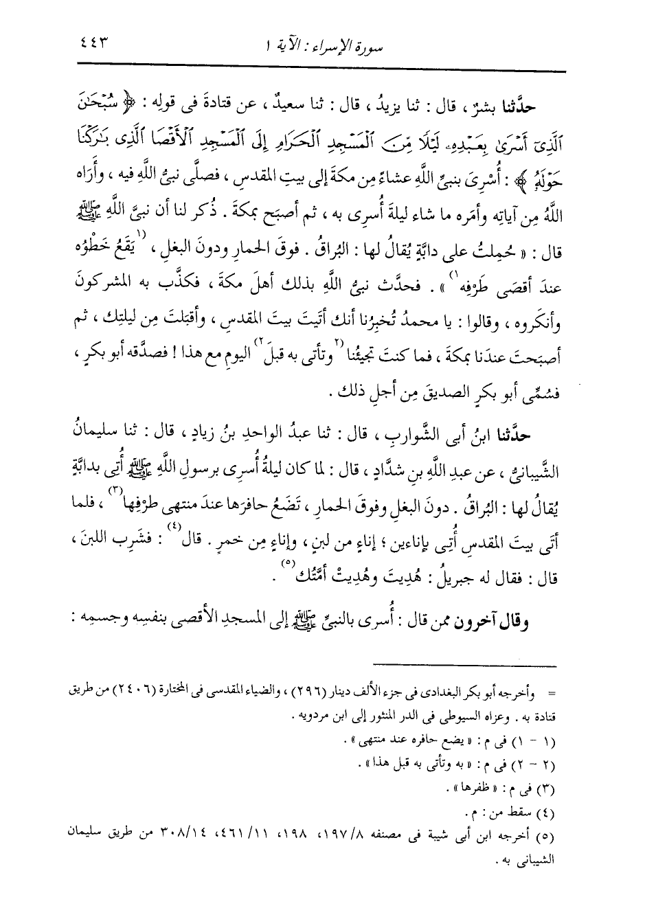 - حَدَّثَنَا بِشْرٌ، قَالَ: ثنا يَزِيدُ، قَالَ: ثنا سَعِيدٌ، عَنْ قَتَادَةَ، فِي قَوْلِهِ: {§سُبْحَانَ الَّذِي أَسْرَى بِعَبْدِهِ لَيْلًا مِنَ الْمَسْجِدِ الْحَرَامِ إِلَى الْمَسْجِدِ الْأَقْصَى الَّذِي بَارَكْنَا حَوْلَهُ} [الإسراء: 1] أُسْرِيَ بِنَبِيِّ اللَّهِ عِشَاءً مِنْ مَكَّةَ إِلَى بَيْتِ الْمَقْدِسِ، فَصَلَّى نَبِيُّ اللَّهِ فِيهِ فَأَرَاهُ اللَّهُ مِنْ آيَاتِهِ وَأَمْرِهِ بِمَا شَاءَ لَيْلَةَ أُسْرِيَ بِهِ، ثُمَّ أَصْبَحَ بِمَكَّةَ