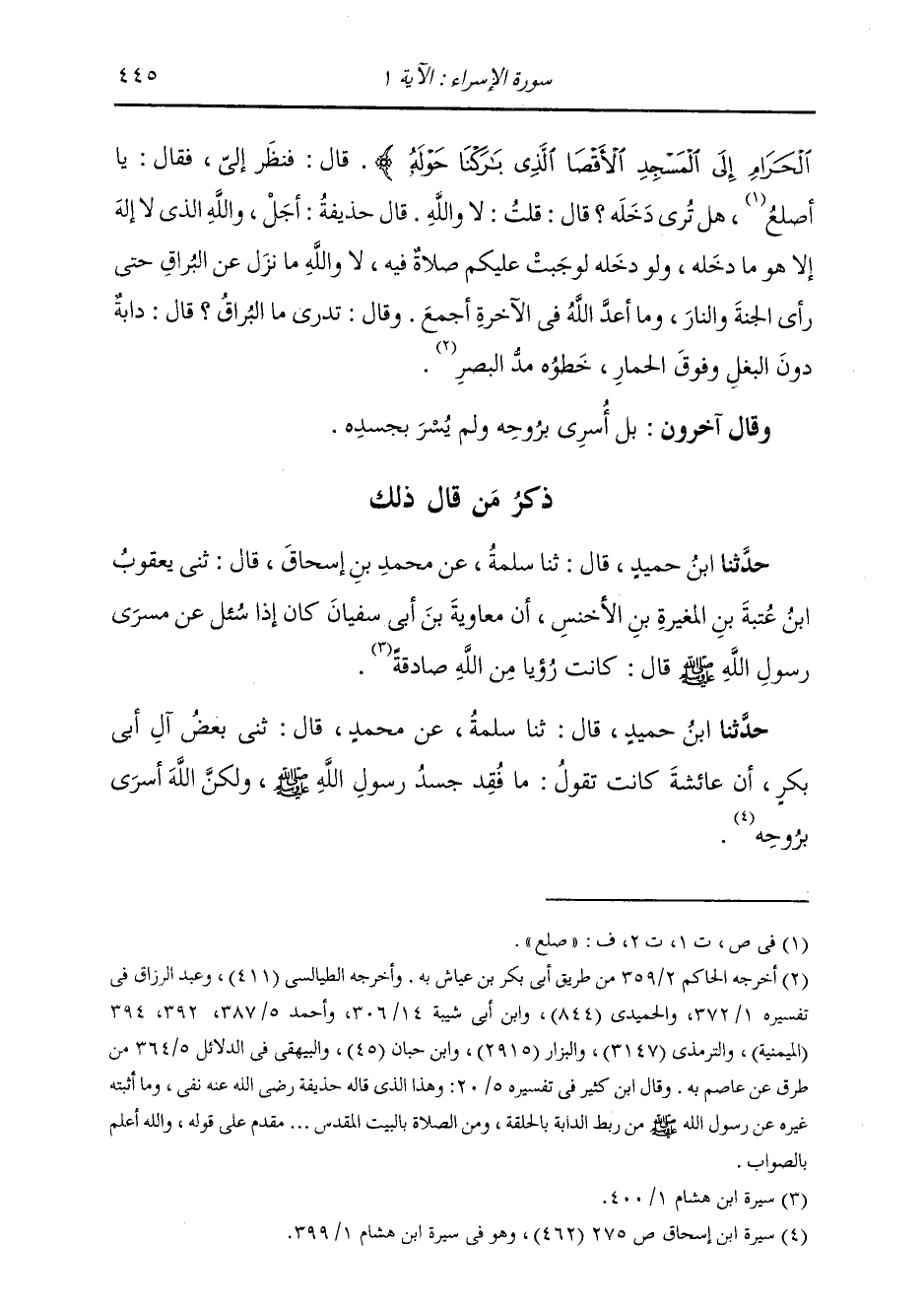 حَدَّثَنَا ابْنُ حُمَيْدٍ، قَالَ: ثنا سَلَمَةُ، عَنْ مُحَمَّدٍ، قَالَ: ثني بَعْضُ آلِ أَبِي بَكْرٍ، أَنَّ عَائِشَةَ، كَانَتْ تَقُولُ: §مَا فُقِدَ جَسَدُ رَسُولِ اللَّهِ صَلَّى اللهُ عَلَيْهِ وَسَلَّمَ، وَلَكِنَّ اللَّهَ أَسْرَى بِرُوحِهِ
