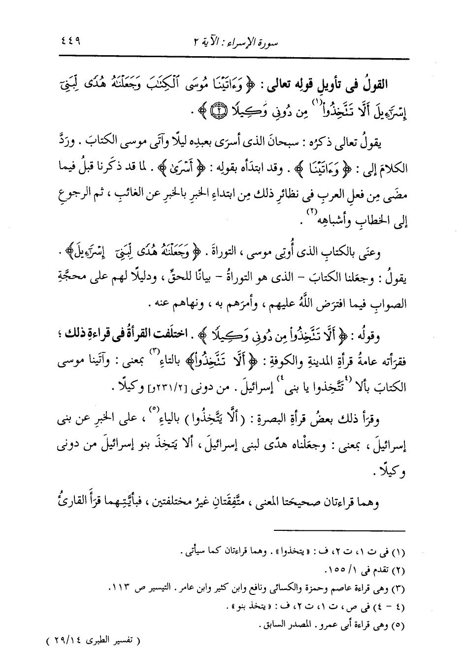 §الْقَوْلُ فِي تَأْوِيلِ قَوْلِهِ تَعَالَى: {وَآتَيْنَا مُوسَى الْكِتَابَ وَجَعَلْنَاهُ هُدًى لِبَنِي إِسْرَائِيلَ أَلَّا تَتَّخِذُوا مِنْ دُونِي وَكِيلًا} [الإسراء: 2] يَقُولُ تَعَالَى ذِكْرُهُ: سُبْحَانَ الَّذِي أَسْرَى بِعَبْدِهِ لَيْلًا وَآتَى مُوسَى الْكِتَابَ، وَرَدَّ الْكَلَامَ إِلَى {وَآتَيْنَا} [البقرة: 87] وَقَدِ ابْتَدَأَ بِقَوْلِهِ أَسْرَى، لِمَا قَدْ ذَكَرْنَا قَبْلُ فِيمَا مَضَى مِنْ فِعْلِ الْعَرَبِ فِي نَظَائِرِ ذَلِكَ مِنِ ابْتِدَاءِ الْخَبَرِ بِالْخَبَرِ عَنِ الْغَائِبِ، ثُمَّ الرُّجُوعِ إِلَى الْخَطَّابِ وَأَشْبَاهِهِ. وَعَنَى بِالْكِتَابِ الَّذِي أُوتِي مُوسَى: التَّوْرَاةَ