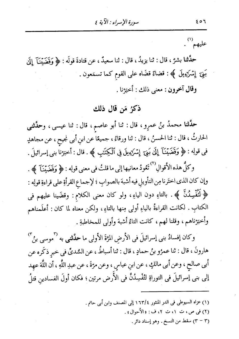 حَدَّثَنَا بِشْرٌ، قَالَ: ثنا يَزِيدُ، قَالَ: ثنا سَعِيدٌ، عَنْ قَتَادَةَ، قَوْلِهِ: {§وَقَضَيْنَا إِلَى بَنِي إِسْرَائِيلَ} [الإسراء: 4] قَضَاءً قَضَاهُ عَلَى الْقَوْمِ كَمَا تَسْمَعُونَ وَقَالَ آخَرُونَ: مَعْنَى ذَلِكَ: أَخْبَرْنَا