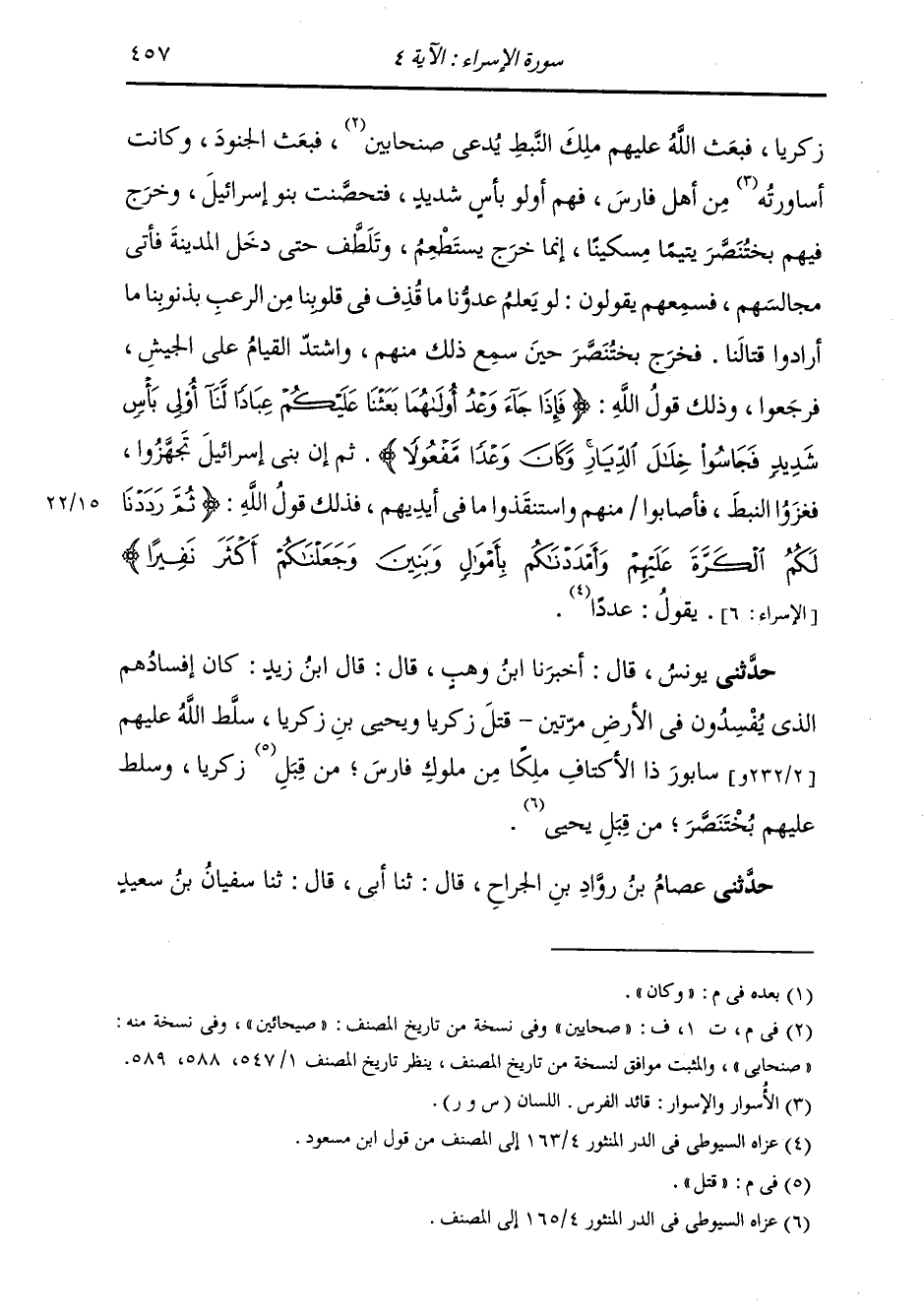 زَكَرِيَّا، فَبَعَثَ اللَّهُ عَلَيْهِمْ مَلِكَ النَّبَطِ، وَكَانَ يُدْعَى صَحَابِينَ فَبَعَثَ الْجُنُودَ، وَكَانَ أَسَاوِرَتُهُ مِنْ أَهْلِ فَارِسَ، فَهُمْ أُولُو بَأْسٍ شَدِيدٍ، فَتَحَصَنَتْ بَنُو إِسْرَائِيلَ، وَخَرَجَ فِيهِمْ بُخْتَنَصَّرَ يَتِيمًا مِسْكِينًا، إِنَّمَا خَرَجَ يَسْتَطْعِمُ، وَتَلَطَّفَ حَتَّى دَخَلَ الْمَدِينَةَ فَأَتَى مَجَالِسَهُمْ، فَسَمِعَهُمْ يَقُولُونَ: لَوْ يَعْلَمُ عَدُوُّنَا مَا قُذِفَ فِي قُلُوبِنَا مِنَ الرُّعْبِ بِذُنُوبِنَا مَا أَرَادُوا قِتَالَنَا، فَخَرَجَ بُخْتَنَصَّرَ حِينَ سَمِعَ ذَلِكَ مِنْهُمْ، وَاشْتَدَّ الْقِيَامُ عَلَى الْجَيْشِ، فَرَجَعُوا، وَذَلِكَ قَوْلُ اللَّهِ: {فَإِذَا جَاءَ وَعْدُ أَوْلَاهُمَا بَعَثْنَا عَلَيْكُمْ عِبَادًا لَنَا أُولِي بَأْسٍ شَدِيدٍ فَجَاسُوا خِلَالَ الدِّيَارِ وَكَانَ وَعْدًا مَفْعُولًا} [الإسراء: 5] ثُمَّ إِنَّ بَنِي إِسْرَائِيلَ تَجَهَّزُوا، فَغَزَوُا النَّبَطَ، فَأَصَابُوا مِنْهُمْ وَاسْتَنْقَذُوا مَا فِي أَيْدِيهِمْ، فَذَلِكَ قَوْلُ اللَّهِ {ثُمَّ رَدَدْنَا لَكُمُ الْكَرَّةَ عَلَيْهِمْ وَأَمْدَدْنَاكُمْ بِأَمْوَالٍ وَبَنِينَ وَجَعَلْنَاكُمْ أَكْثَرَ نَفِيرًا} [الإسراء: 6] يَقُولُ: عَدَدًا