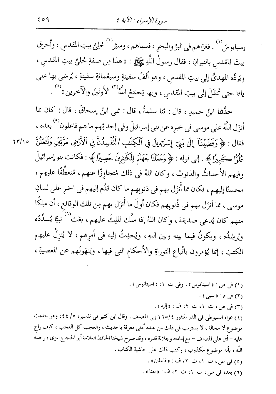 - حَدَّثَنَا ابْنُ حُمَيْدٍ، قَالَ: ثنا سَلَمَةُ، قَالَ: ثني ابْنُ إِسْحَاقَ، قَالَ: كَانَ مِمَّا §أَنْزَلَ اللَّهُ عَلَى مُوسَى فِي خَبَرِهِ عَنْ بَنِي إِسْرَائِيلَ، وَفِي إِحْدَاثِهِمْ مَا هُمْ فَاعِلُونَ بَعْدَهُ، فَقَالَ: {وَقَضَيْنَا إِلَى بَنِي إِسْرَائِيلَ فِي الْكِتَابِ لَتُفْسِدُنَّ فِي الْأَرْضِ مَرَّتَيْنِ وَلَتَعْلُنَّ عُلُوًّا كَبِيرًا} [الإسراء: 4] . . إِلَى قَوْلِهِ: {وَجَعَلْنَا جَهَنَّمَ لِلْكَافِرِينَ حَصِيرًا} [الإسراء: 8] فَكَانَتْ بَنُو إِسْرَائِيلَ، وَفِيهِمُ الْأَحْدَاثُ وَالذُّنُوبُ، وَكَانَ اللَّهُ فِي ذَلِكَ مُتَجَاوِزًا عَنْهُمْ، مُتَعَطِّفًا عَلَيْهِمْ مُحْسِنًا إِلَيْهِمْ، فَكَانَ مِمَّا أَنْزَلَ بِهِمْ فِي ذُنُوبِهِمْ مَا كَانَ قَدِمَ إِلَيْهِمْ فِي الْخَبَرِ عَلَى لِسَانِ مُوسَى مِمَّا أَنْزَلَ بِهِمْ فِي ذُنُوبِهِمْ. فَكَانَ أَوَّلُ مَا أَنْزَلَ بِهِمْ مِنْ تِلْكَ الْوَقَائِعِ أَنَّ مَلِكًا مِنْهُمْ كَانَ يُدْعَى صَدِيقَةَ، وَكَانَ اللَّهُ إِذَا مَلَّكَ الْمَلِكَ عَلَيْهِمْ، بَعَثَ نَبِيًّا يُسَدِّدُهُ وَيُرْشِدُهُ، وَيَكُونُ فِيمَا بَيْنَهُ وَبَيْنَ اللَّهِ، وَيُحَدِّثُ إِلَيْهِ فِي أَمْرِهِمْ، لَا يُنْزِلُ عَلَيْهِمُ الْكُتُبَ، إِنَّمَا يُؤْمَرُونَ بِاتِّبَاعِ التَّوْرَاةِ وَالْأَحْكَامِ الَّتِي فِيهَا، وَيَنْهَوْنَهُمْ عَنِ الْمَعْصِيَةِ، -[460]- وَيَدْعُونَهُمْ إِلَى مَا تَرَكُوا مِنَ الطَّاعَةَ، فَلَمَّا مَلَكَ ذَلِكَ الْمَلِكُ، بَعَثَ اللَّهُ مَعَهُ شِعْيَاءَ بْنَ أَمْصِيَا، وَذَلِكَ قَبْلَ مَبْعَثِ زَكَرِيَّا وَيَحْيَى وَعِيسَى وَشِعْيَاءَ الَّذِي بَشَّرَ بِعِيسَى وَمُحَمَّدٍ، فَمَلَكَ ذَلِكَ الْمَلِكُ بَنِي إِسْرَائِيلَ وَبَيْتِ الْمَقْدِسِ زَمَانًا، فَلَمَّا انْقَضَى مُلْكُهُ عَظُمَتْ فِيهِمُ الْأَحْدَاثُ، وَشِعْيَاءَ مَعَهُ، بَعَثَ اللَّهُ عَلَيْهِمْ سَنْحَارِيبَ مَلِكَ بَابِلَ، وَمَعَهُ سِتُّ مِائَةِ أَلْفِ رَايَةٍ، فَأَقْبَلَ سَائِرًا حَتَّى نَزَلَ نَحْوَ بَيْتِ الْمَقْدِسِ، وَالْمَلِكُ مَرِيضٌ فِي سَاقِهِ قُرْحَةٌ، فَجَاءَ النَّبِيُّ شِعْيَاءَ، فَقَالَ لَهُ: يَا مَلِكَ بَنِي إِسْرَائِيلَ إِنَّ سَنْحَارِيبَ مَلِكَ بَابِلَ، قَدْ نَزَلَ بِكَ هُوَ وَجُنُودُهُ سِتُّ مِائَةِ أَلْفِ رَايَةٍ، وَقَدْ هَابَهُمُ النَّاسُ وَفَرَقُوا مِنْهُمْ، فَكَبُرَ ذَلِكَ عَلَى الْمَلِكِ، فَقَالَ: يَا نَبِيَّ اللَّهِ هَلْ أَتَاكَ وَحْيٌ مِنَ اللَّهِ فِيمَا حَدَثَ فَتُخْبِرَنَا بِهِ كَيْفَ يَفْعَلُ اللَّهُ بِنَا وَبِسَنْحَارِيبَ وَجُنُودِهِ؟ فَقَالَ لَهُ النَّبِيُّ عَلَيْهِ السَّلَامُ: لَمْ يَأْتِنِي وَحْيٌ أُحَدِّثُ إِلَيَّ فِي شَأْنِكَ. فَبَيْنَا هُمْ عَلَى ذَلِكَ، أَوْحَى اللَّهُ إِلَى شِعْيَاءَ النَّبِيِّ: أَنِ ائْتِ مَلِكَ بَنِي إِسْرَائِيلَ، فَمُرْهُ أَنْ يُوصِيَ وَصِيَّتَهُ، وَيَسْتَخْلِفَ عَلَى مُلْكِهِ مَنْ شَاءَ مِنْ أَهْلِ بَيْتِهِ. فَأَتَى النَّبِيُّ شِعْيَاءُ مَلِكَ بَنِي إِسْرَائِيلَ صَدِيقَةَ، فَقَالَ لَهُ: إِنَّ رَبَّكَ قَدْ أَوْحَى إِلَيَّ أَنْ آمُرَكَ أَنْ تُوصِيَ وَصِيَّتَكَ، وَتَسْتَخْلِفَ مَنْ شِئْتَ عَلَى مُلْكِكَ مِنْ أَهْلِ بَيْتِكَ، فَإِنَّكَ مَيِّتٌ، فَلَمَّا قَالَ ذَلِكَ شِعْيَاءُ لِصَدِيقَةَ، أَقْبَلَ عَلَى الْقِبْلَةِ، فَصَلَّى وَسَبَّحَ وَدَعَا وَبَكَى، فَقَالَ وَهُوَ يَبْكِي وَيَتَضَرَّعُ إِلَى اللَّهِ بِقَلْبٍ مُخْلِصٍ وَتَوَكُّلٍ وَصَبْرٍ وَصِدْقٍ وَظَنٍّ صَادِقٍ. اللَّهُمَّ رَبَّ الْأَرْبَابِ، وَإِلَهَ الْآلِهَةِ، قُدُّوسَ الْمُتَقَدِّسِينَ، يَا رَحْمَنُ يَا رَحِيمُ، الْمُتَرَحِّمُ الرَّءُوفُ الَّذِي لَا تَأْخُذُهُ سِنَةٌ وَلَا نَوْمٌ، اذْكُرْنِي بِعَمَلِي وَفِعْلِي وَحُسْنِ قَضَائِي عَلَى بَنِي
