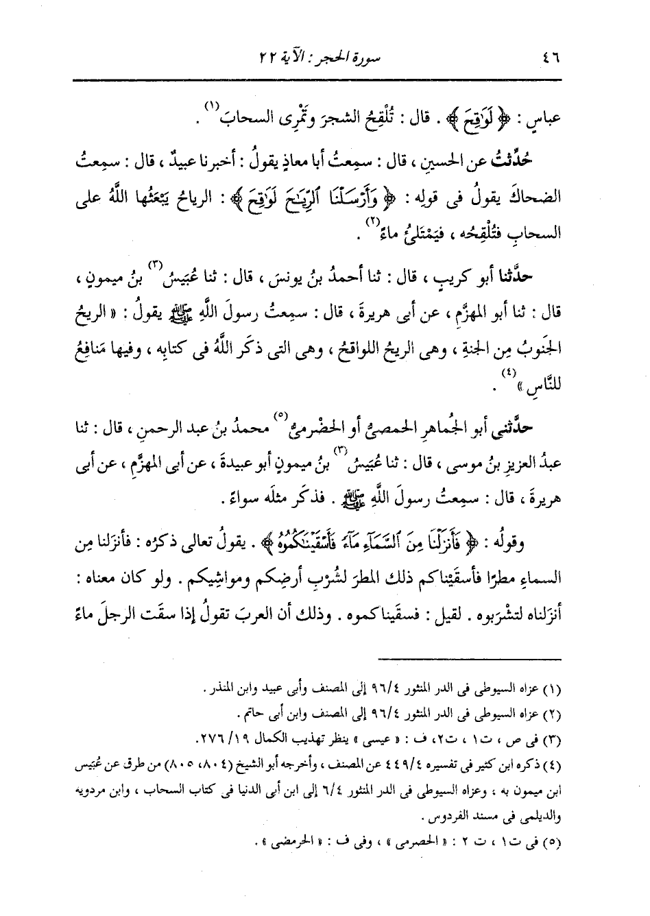 حُدِّثْتُ عَنِ الْحُسَيْنِ، قَالَ: سَمِعْتُ أَبَا مُعَاذٍ، يَقُولُ: أَخْبَرَنَا عُبَيْدٌ، قَالَ: سَمِعْتُ الضَّحَّاكَ، يَقُولُ فِي قَوْلِهِ: {§وَأَرْسَلْنَا الرِّيَاحَ لَوَاقِحَ} [الحجر: 22] «الرِّيَاحُ يَبْعَثُهَا اللَّهُ عَلَى السَّحَابِ فَتُلْقِحُهُ فَيَمْتَلِئُ مَاءً»