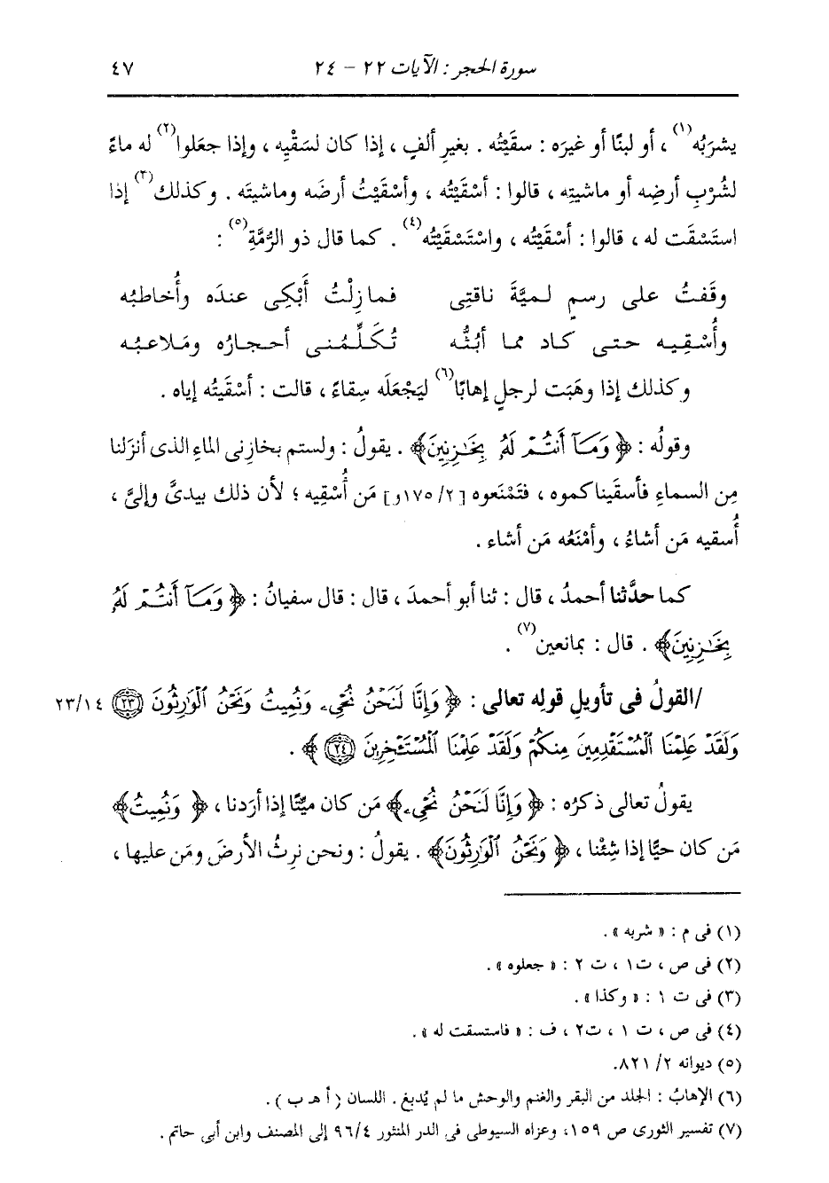 §الْقَوْلُ فِي تَأْوِيلِ قَوْلِهِ تَعَالَى: {وَإِنَّا لَنَحْنُ نُحْيِي وَنُمِيتُ وَنَحْنُ الْوَارِثُونَ. وَلَقَدْ عَلِمْنَا الْمُسْتَقْدِمِينَ مِنكُمْ وَلَقَدْ عَلِمْنَا الْمُسْتَأْخِرِينَ. وَإِنَّ رَبَّكَ هُوَ يَحْشُرُهُمْ، إِنَّهُ حَكِيمٌ عَلِيمٌ} [الحجر: 24] يَقُولُ تَعَالَى ذِكْرُهُ: {وَإِنَّا لَنَحْنُ نُحْيِي} [الحجر: 23] مَنْ كَانَ مَيِّتًا إِذَا أَرَدْنَا {وَنُمِيتُ} [الحجر: 23] مَنْ كَانَ حَيًّا إِذَا شِئْنَا {وَنَحْنُ الْوَارِثُونَ} [الحجر: 23] يَقُولُ: وَنَحْنُ نَرِثُ الْأَرْضَ وَمَنْ عَلَيْهَا -[48]- بِأَنْ نُمِيتَ جَمِيعَهُمْ، فَلَا يَبْقَى حَيٌّ سِوَانَا إِذَا جَاءَ ذَلِكَ الْأَجَلُ