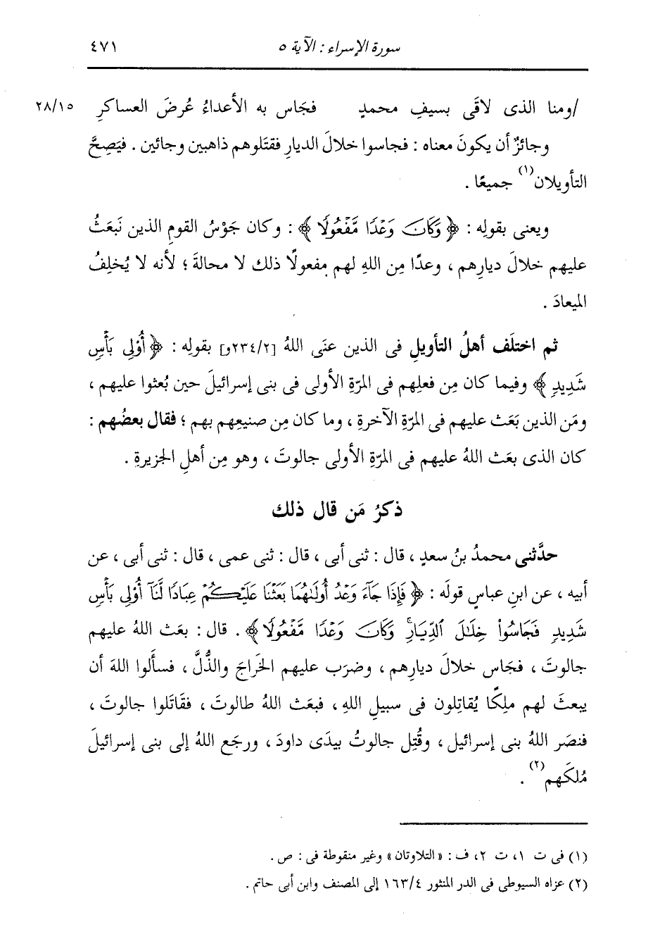 ذِكْرُ مَنْ قَالَ ذَلِكَ: حَدَّثَنِي مُحَمَّدُ بْنُ سَعْدٍ، قَالَ: ثنا أَبِي قَالَ، ثني عَمِّي، قَالَ: ثني أَبِي، عَنْ أَبِيهِ، عَنِ ابْنِ عَبَّاسٍ، قَوْلِهِ: {§فَإِذَا جَاءَ وَعْدُ أَوْلَاهُمَا بَعَثْنَا عَلَيْكُمْ عِبَادًا لَنَا أُولِي بَأْسٍ شَدِيدٍ فَجَاسُوا خِلَالَ الدِّيَارِ وَكَانَ وَعْدًا مَفْعُولًا} [الإسراء: 5] قَالَ: بَعَثَ اللَّهُ عَلَيْهِمْ جَالُوتَ فَجَاسَ خِلَالَ دِيَارِهِمْ، وَضَرَبَ عَلَيْهِمُ الْخَرَاجَ وَالذُّلَّ، فَسَأَلُوا اللَّهَ أَنْ يَبْعَثَ لَهُمْ مَلِكًا يُقَاتِلُونَ فِي سَبِيلِ اللَّهِ، فَبَعَثَ اللَّهُ طَالُوتَ، فَقَاتَلُوا جَالُوتَ، فَنَصَرَ اللَّهُ بَنِي إِسْرَائِيلَ، وَقُتِلَ جَالُوتُ بِيَدِي دَاوُدَ، وَرَجَعَ اللَّهُ إِلَى بَنِي إِسْرَائِيلَ مَلِكُهُمْ