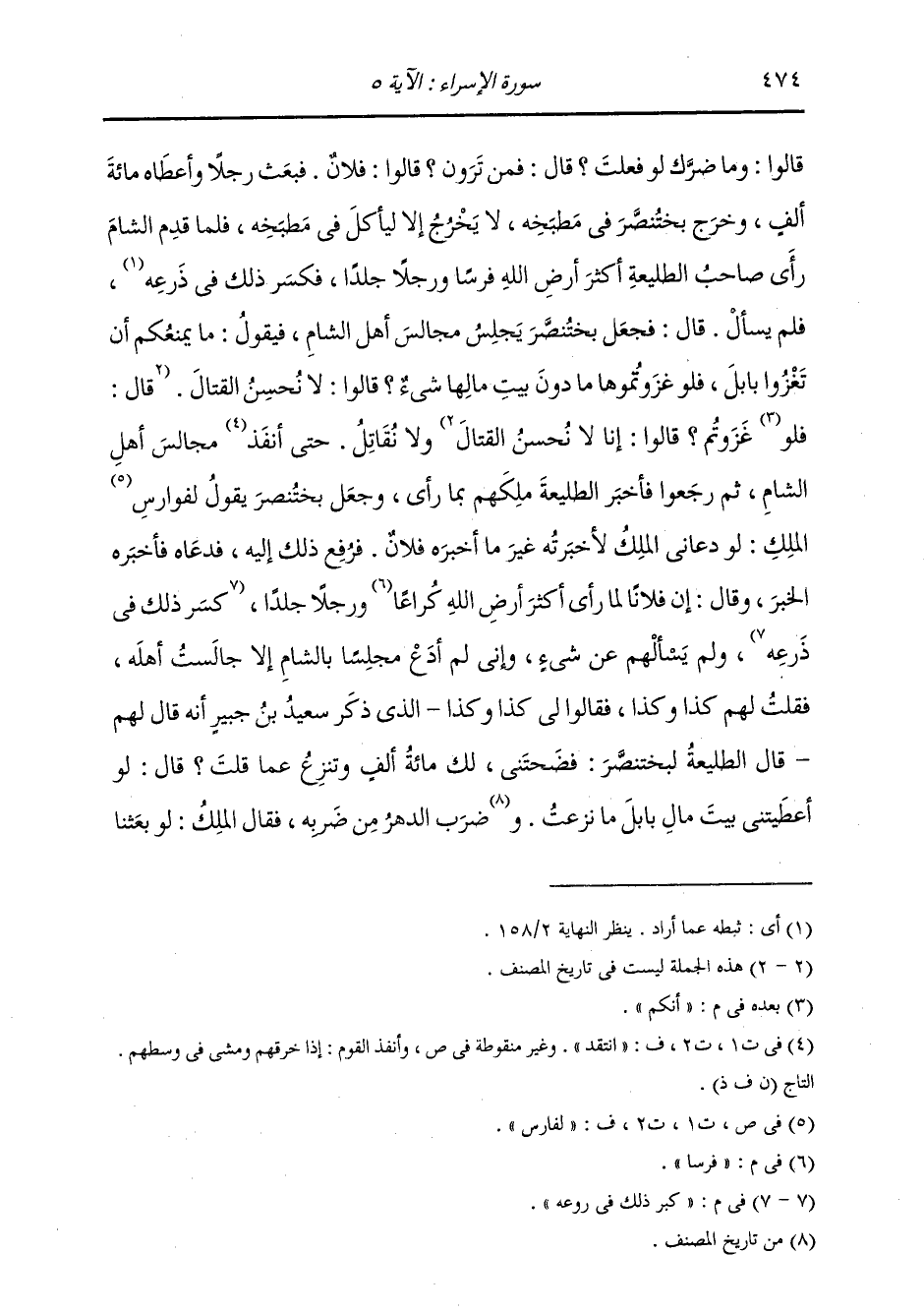 قَالُوا: وَمَا ضَرُّكَ لَوْ فَعَلْتَ؟ قَالَ: فَمَنْ تَرَوْنَ؟ قَالُوا: فُلَانٌ، فَبَعَثَ رَجُلًا وَأَعْطَاهُ مِائَةَ أَلْفٍ، وَخَرَجَ بُخْتَنَصَّرَ فِي مَطْبَخِهِ، لَمْ يَخْرُجْ إِلَّا لِيَأْكُلَ فِي مَطْبَخِهِ، فَلَمَّا قَدِمَ الشَّامَ وَرَأَى صَاحِبَ الطَّلِيعَةِ أَكْثَرَ أَرْضِ اللَّهِ فَرَسًا وَرَجُلًا جَلْدًا، فَكَسَرَ ذَلِكَ فِي ذَرْعِهِ، فَلَمْ يَسْأَلْ، قَالَ: فَجَعَلَ بُخْتَنَصَّرَ يَجْلِسُ مَجَالِسَ أَهْلِ الشَّامِ فَيَقُولُ: مَا يَمْنَعُكُمْ أَنْ تَغْزُوا بَابِلَ، فَلَوْ غَزَوْتُمُوهَا مَا دُونَ بَيْتِ مَالِهَا شَيْءٌ، قَالُوا: لَا نُحْسِنُ الْقِتَالَ، قَالَ: فَلَوْ أَنَّكُمْ غَزَوْتُمْ، قَالُوا: إِنَّا لَا نُحْسِنُ الْقِتَالَ وَلَا نُقَاتِلُ حَتَّى أَنْفَذَ مَجَالِسَ أَهْلِ الشَّامِ، ثُمَّ رَجَعُوا فَأَخْبَرَ الطَّلِيعَةَ مَلِكُهُمْ بِمَا رَأَى، وَجَعَلَ بُخْتَنَصَّرَ يَقُولُ لِفَوَارِسِ الْمَلِكِ: لَوْ دَعَانِي الْمَلِكُ لَأَخْبَرْتُهُ غَيْرَ مَا أَخْبَرَهُ فُلَانٌ، فَرَفَعَ ذَلِكَ إِلَيْهِ، فَدَعَاهُ فَأَخْبَرَهُ الْخَبَرَ وَقَالَ: إِنَّ فُلَانًا لَمَّا رَأَى أَكْثَرَ أَرْضِ اللَّهِ فَرَسًا وَرَجُلًا جَلْدًا، كَبُرَ ذَلِكَ فِي رَوْعِهِ وَلَمْ يَسْأَلْهُمْ عَنْ شَيْءٍ، وَإِنِّي لَمْ أَدَعْ مَجْلِسًا بِالشَّامِ إِلَّا جَالَسْتُ أَهْلَهُ، فَقُلْتُ لَهُمْ كَذَا وَكَذَا، وَقَالُوا لِي كَذَا وَكَذَا الَّذِي ذَكَرَ سَعِيدُ بْنُ جُبَيْرٍ أَنَّهُ قَالَ لَهُمْ: قَالَ الطَّلِيعَةُ لبُخْتَنَصَّرَ: إِنَّكَ فَضَحْتَنِي لَكَ مِائَةُ أَلْفٍ وَتَنْزِعُ عَمَّا قُلْتَ، قَالَ: لَوْ أَعْطَيْتَنِي بَيْتَ مَالِ بَابِلَ مَا نَزَعْتُ، ضَرَبَ الدَّهْرُ مِنْ ضَرْبِهِ، فَقَالَ الْمَلِكُ: لَوْ بَعَثَنَا