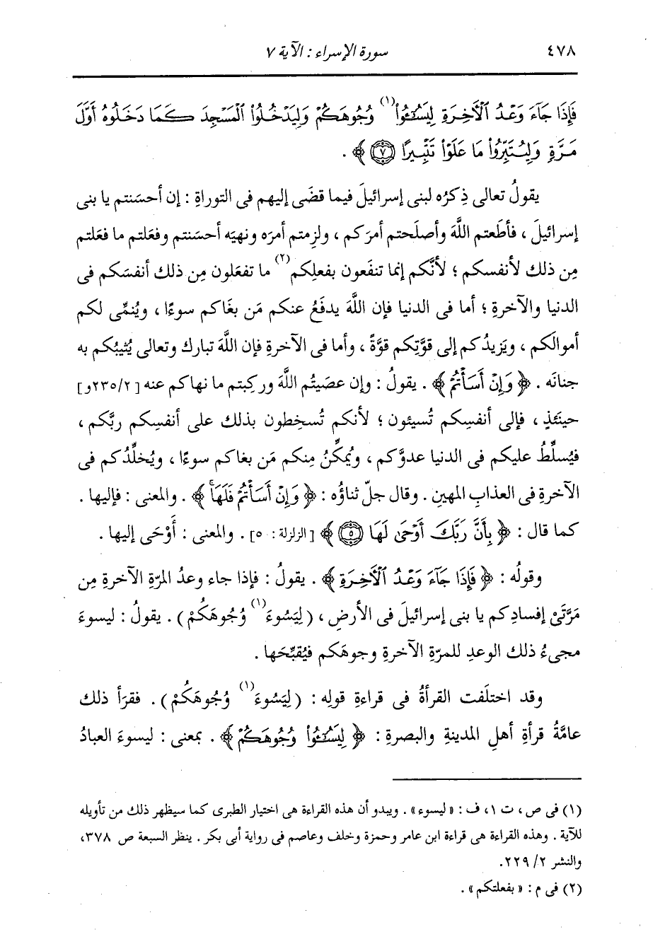 فَإِذَا جَاءَ وَعْدُ الآَخِرَةِ لِيَسُوءُوا وُجُوهَكُمْ وَلِيَدْخُلُوا الْمَسْجِدَ كَمَا دَخَلُوهُ أَوَّلَ مَرَّةٍ وَلِيُتَبِّرُوا مَا عَلَوْا تَتْبِيرًا} يَقُولُ تَعَالَى ذِكْرُهُ لِبَنِي إِسْرَائِيلَ فِيمَا قَضَى إِلَيْهِمْ فِي التَّوْرَاةِ: {إِنْ أَحْسَنْتُمْ} [الإسراء: 7] يَا بَنِي إِسْرَائِيلَ، فَأَطَعْتُمُ اللَّهَ وَأَصْلَحْتُمْ أَمْرَكُمْ وَلَزِمْتُمْ أَمْرَهُ وَنَهْيَهُ {أَحْسَنْتُمْ} [الإسراء: 7] وَفَعَلْتُمْ مَا فَعَلْتُمْ مِنْ ذَلِكَ {لِأَنْفُسِكُمْ} [البقرة: 110] لِأَنَّكُمْ إِنَّمَا تَنْفَعُونَ بِفَعْلَتِكُمْ مَا تَفْعَلُونَ مِنْ ذَلِكَ أَنْفُسَكُمْ فِي الدُّنْيَا وَالْآخِرَةِ. أَمَّا فِي الدُّنْيَا فَإِنَّ اللَّهَ يَدْفَعُ عَنْكُمْ مَنْ بَغَاكُمْ سُوءًا، وَيُنَمِّي لَكُمْ أَمْوَالَكُمْ، وَيَزِيدُكُمْ إِلَى قُوَّتِكُمْ قُوَّةً. وَأَمَّا فِي الْآخِرَةِ فَإِنَّ اللَّهَ تَعَالَى يُثِيبُكُمْ بِهِ جِنَانَهُ {وَإِنْ أَسَأْتُمْ} [الإسراء: 7] يَقُولُ: وَإِنْ عَصَيْتُمُ اللَّهَ وَرَكِبْتُمْ مَا نَهَاكُمْ عَنْهُ حِينَئِذٍ، فَإِلَى أَنْفُسِكُمْ تُسيئُونَ، لِأَنَّكُمْ تُسْخِطُونَ بِذَلِكَ عَلَى أَنْفُسِكُمْ رَبَّكُمْ، فَيُسَلِّطُ عَلَيْكُمْ فِي الدُّنْيَا عَدُوَّكُمْ، وَيُمَكِّنُ مِنْكُمْ مَنْ بَغَاكُمْ سُوءًا، وَيُخَلِّدُكُمْ فِي الْآخِرَةِ فِي الْعَذَابِ الْمُهِينِ. وَقَالَ جَلَّ ثَنَاؤُهُ {وَإِنْ أَسَأْتُمْ فَلَهَا} [الإسراء: 7] وَالْمَعْنَى: فَإِلَيْهَا كَمَا قَالَ {بِأَنَّ رَبَّكَ أَوْحَى لَهَا} [الزلزلة: 5] وَالْمَعْنَى: أَوْحَى إِلَيْهَا