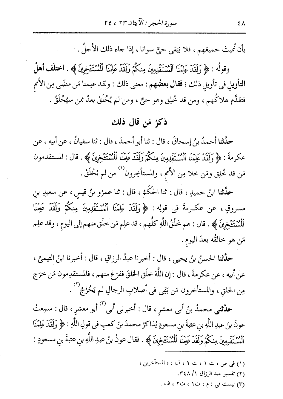 حَدَّثَنَا ابْنُ حُمَيْدٍ قَالَ: ثنا الْحَكَمُ قَالَ: ثنا عَمْرُو بْنُ قَيْسٍ، عَنْ سَعِيدِ بْنِ مَسْرُوقٍ، عَنْ عِكْرِمَةَ، فِي قَوْلِهِ: {§وَلَقَدْ عَلِمْنَا الْمُسْتَقْدِمِينَ مِنْكُمْ وَلَقَدْ عَلِمْنَا الْمُسْتَأْخِرِينَ} [الحجر: 24] قَالَ: «هُمْ خَلْقُ اللَّهِ كُلِّهِمْ، قَدْ عَلِمَ مَنْ خُلِقَ مِنْهُمْ إِلَى الْيَوْمِ، وَقَدْ عَلِمَ مَنْ هُوَ خَالِقُهُ بَعْدَ الْيَوْمِ»