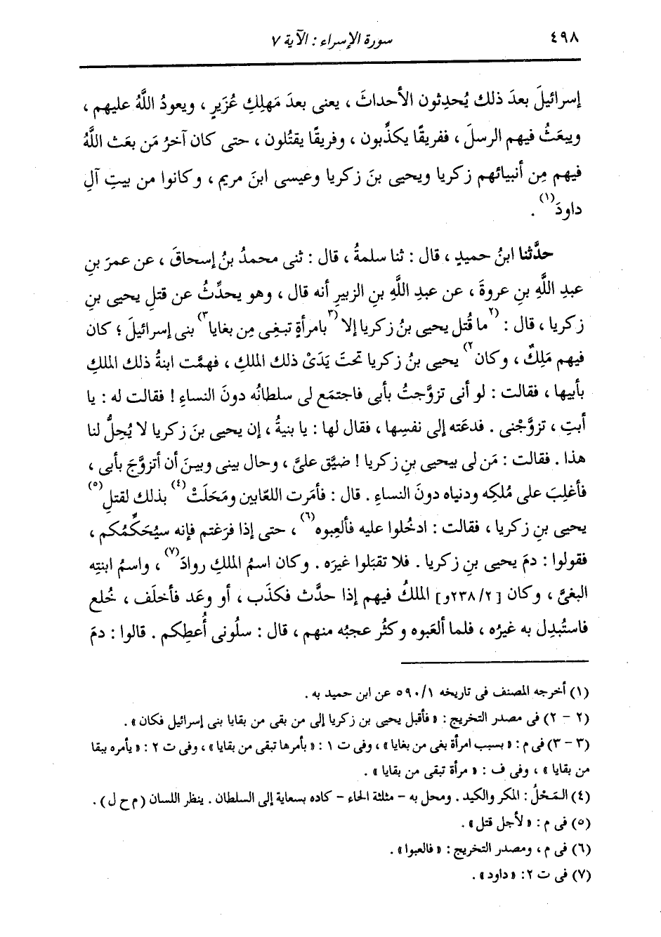 حَدَّثَنَا ابْنُ حُمَيْدٍ، قَالَ: ثنا سَلَمَةُ، قَالَ: ثني مُحَمَّدُ بْنُ إِسْحَاقَ، عَنْ عُمَرَ بْنِ عَبْدِ اللَّهِ بْنِ عُرْوَةَ، عَنْ عَبْدِ اللَّهِ بْنِ الزُّبَيْرِ، أَنَّهُ قَالَ وَهُوَ يُحَدِّثُ عَنْ قَتْلِ يَحْيَى بْنِ زَكَرِيَّا قَالَ: §مَا قُتِلَ يَحْيَى بْنُ زَكَرِيَّا إِلَّا بِسَبَبِ امْرَأَةٍ بَغِيٍّ مِنْ بَغَايَا بَنِي إِسْرَائِيلَ، كَانَ فِيهِمْ مَلِكٌ، وَكَانَ يَحْيَى بْنُ زَكَرِيَّا تَحْتَ يَدَيْ ذَلِكَ الْمَلِكِ، فَهَمَّتِ ابْنَةُ ذَلِكَ الْمَلِكِ بِأَبِيهَا، فَقَالَتْ: لَوْ أَنِّي تَزَوَّجْتُ بِأَبِي فَاجْتَمَعَ لِي سُلْطَانُهُ دُونَ النِّسَاءِ، فَقَالَتْ لَهُ: يَا أَبَتِ تَزَوَّجْنِي وَدَعَتْهُ إِلَى نَفْسِهَا، فَقَالَ لَهَا: يَا بُنَيَّةُ إِنَّ يَحْيَى بْنَ زَكَرِيَّا لَا يُحِلُّ لَنَا هَذَا، فَقَالَتْ: مَنْ لِي بِيَحْيَى بْنِ زَكَرِيَّا؟ ضَيَّقَ عَلَيَّ وَحَالَ بَيْنِي وَبَيْنَ أَنْ أَتَزَوَّجَ بِأَبِي فَأَغْلِبَ عَلَى مُلْكِهِ وَدُنْيَاهُ دُونَ النِّسَاءِ قَالَ: فَأَمَرَتِ اللَّعَّابِينَ وَمَحَلَتْ بِذَلِكَ لِأَجْلِ قَتْلِ يَحْيَى بْنِ زَكَرِيَّا، فَقَالَتِ: ادْخُلُوا عَلَيْهِ فَالْعَبُوا، حَتَّى إِذَا فَرَغْتُمْ فَإِنَّهُ سَيُحَكِّمُكُمْ، فَقُولُوا: دَمُ يَحْيَى بْنِ زَكَرِيَّا، وَلَا تَقْبَلُوا غَيْرَهُ. وَكَانَ اسْمُ الْمَلِكِ رَوَّادَ، وَاسْمُ ابْنَتِهِ الْبَغِيَّ، وَكَانَ الْمَلِكُ فِيهِمْ إِذَا حَدَّثَ فَكَذَبَ، أَوْ وَعَدَ فَأَخْلَفَ خُلِعَ فَاسْتُبْدِلَ بِهِ غَيْرُهُ، فَلَمَّا أَلْعَبُوهُ وَكَثُرَ عُجْبُهُ مِنْهُمْ، قَالَ: سَلُونِي أُعْطِكُمْ، فَقَالُوا لَهُ: نَسْأَلُكَ دَمَ