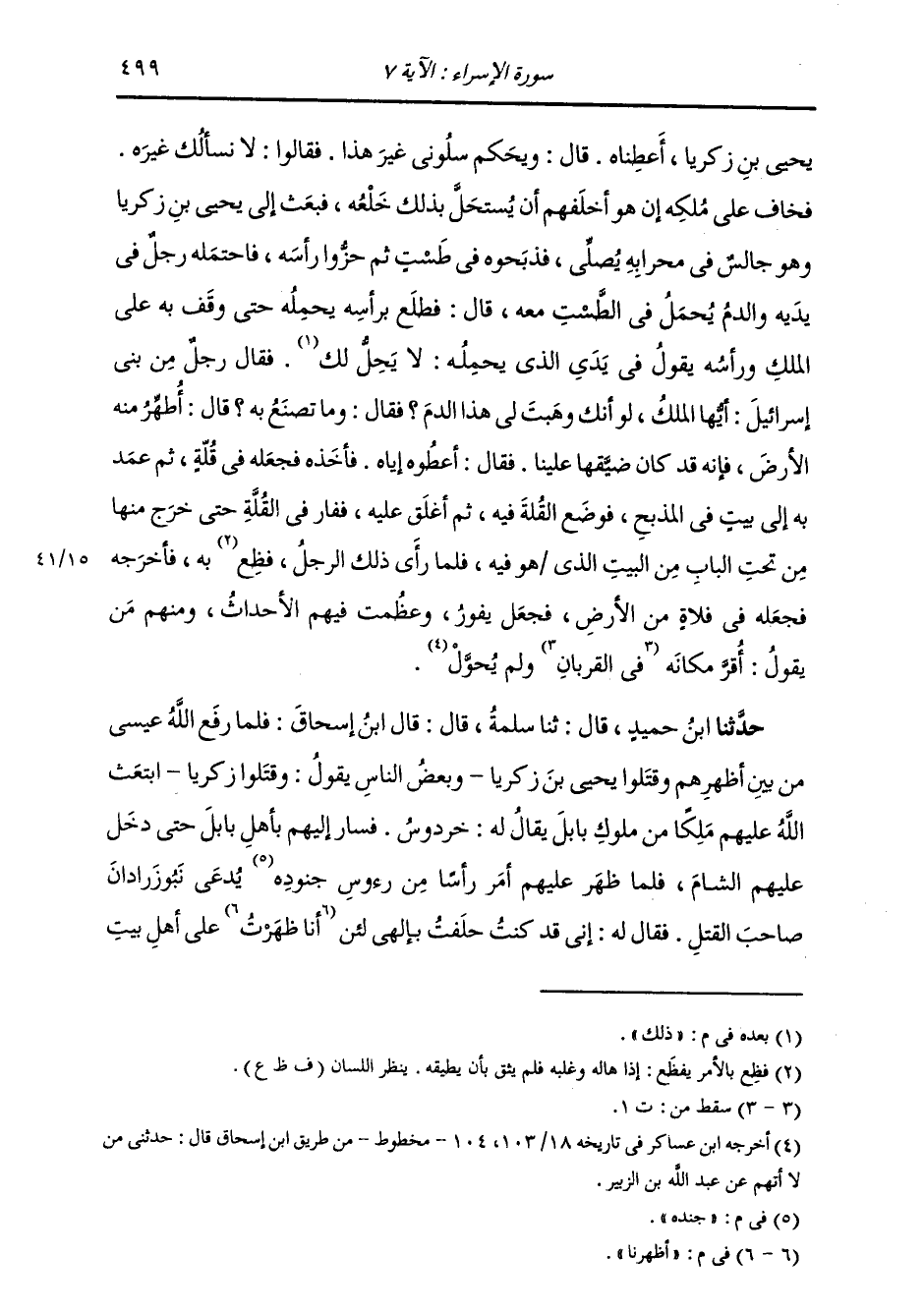 حَدَّثَنَا ابْنُ حُمَيْدٍ، قَالَ: ثنا سَلَمَةُ، قَالَ: قَالَ ابْنُ إِسْحَاقَ: §فَلَمَّا رَفَعَ اللَّهُ عِيسَى مِنْ بَيْنَ أَظْهُرِهِمْ وَقَتَلُوا يَحْيَى بْنَ زَكَرِيَّا (وَبَعْضَ النَّاسِ يَقُولُ: وَقَتَلُوا زَكَرِيَّا) ابْتَعَثَ اللَّهُ عَلَيْهِمْ مَلِكًا مِنْ مُلُوكِ بَابِلَ يُقَالُ لَهُ خَرْدُوسُ، فَسَارَ إِلَيْهِ بِأَهْلِ بَابِلَ حَتَّى دَخَلَ عَلَيْهِمُ الشَّامَ، فَلَمَّا ظَهَرَ عَلَيْهِمْ أَمَرَ رَأْسًا مِنْ رُءُوسِ جُنْدِهِ يُدْعَى نَبُورَ زَاذَانَ صَاحِبُ الْقَتْلِ، فَقَالَ لَهُ: إِنِّي قَدْ كُنْتُ حَلَفْتُ بِإِلَهِي لَئِنْ أَظْهَرَنَا عَلَى أَهْلِ بَيْتِ -[500]- الْمَقْدِسِ لَأَقْتُلَنَّهُمْ حَتَّى تَسِيلَ دِمَاؤُهُمْ فِي وَسَطِ عَسْكَرِي، إِلَّا أَنْ لَا أَجِدَ أَحَدًا أَقْتُلَهُ، فَأَمَرَ أَنْ يَقْتُلَهُمْ حَتَّى يَبْلُغَ ذَلِكَ مِنْهُمْ نبور زادان، فَدَخَلَ بَيْتَ الْمَقْدِسِ، فَقَالَ فِي الْبُقْعَةِ الَّتِي كَانُوا يَقْرَبُونَ فِيهَا قُرْبَانَهُمْ، فَوَجَدَ فِيهَا دَمًا يَغْلِي، فَسَأَلَهُمْ فَقَالَ: يَا بَنِي إِسْرَائِيلَ، مَا شَأْنُ هَذَا الدَّمِ الَّذِي يَغْلِي، أَخْبِرُونِي خَبَرَهُ وَلَا تَكْتُمُونِي شَيْئًا مِنْ أَمْرِهِ؟ فَقَالُوا: هَذَا دَمُ قُرْبَانٍ كَانَ لَنَا كُنَّا قَرَّبْنَاهُ فَلَمْ يُتَقَبَّلْ مِنَّا، فَلِذَلِكَ هُوَ يَغْلِي كَمَا تَرَاهُ وَلَقَدْ قَرَّبْنَا مُنْذُ ثَمَانِ مِائَةِ سَنَةٍ الْقُرْبَانَ فَتُقُبِّلَ مِنَّا إِلَّا هَذَا الْقُرْبَانَ قَالَ: مَا صَدَقْتُمُونِي الْخَبَرَ قَالُوا لَهُ: لَوْ كَانَ كَأَوَّلِ زَمَانِنَا لَقُبِلَ مِنَّا، وَلَكِنَّهُ قَدِ انْقَطَعَ مِنَّا الْمُلْكُ وَالنُّبُوَّةُ وَالْوَحْي، فَلِذَلِكَ لَمْ يُتَقَبَّلْ مِنَّا فَذَبَحَ مِنْهُمْ نبور زادان عَلَى ذَلِكَ الدَّمِ سَبْعَ مِائَةٍ وَسَبْعِينَ رُوحًا مِنْ رُءُوسِهِمْ، فَلَمْ يَهْدَأْ، فَأَمَرَ بِسَبْعِ مِائَةِ غُلَامٍ مِنْ غِلْمَانِهِمٍ فَذُبِحُوا عَلَى الدَّمِ فَلَمْ يَهْدَأْ، فَأَمَرَ بِسَبْعَةِ آلَافٍ مِنْ شِيَعِهِمٍ وَأَزْوَاجِهِمْ، فَذَبَحَهُمْ عَلَى الدَّمِ فَلَمْ يَبْرُدْ وَلَمْ يَهْدَأْ، فَلَمَّا رَأَى نبور زاذان أَنَّ الدَّمَ لَا يَهْدَأُ قَالَ لَهُمْ: وَيْلَكُمْ يَا بَنِي إِسْرَائِيلَ، اصْدُقُونِي وَاصْبِرُوا عَلَى أَمْرِ رَبِّكُمْ، فَقَدْ طَالَ مَا مَلَكْتُمْ فِي الْأَرْضِ، تَفْعَلُونَ فِيهَا مَا شِئْتُمْ قَبْلَ أَنْ لَا أَتْرُكَ مِنْكُمْ نَافِخَ نَارٍ، لَا أُنْثَى وَلَا ذَكَرًا إِلَّا قَتَلْتُهُ، فَلَمَّا رَأَوُا الْجَهْدَ وَشِدَّةَ الْقَتْلِ صَدَقُوهُ الْخَبَرَ، فَقَالُوا لَهُ: إِنَّ هَذَا دَمُ نَبِيٍّ مِنَّا كَانَ يَنْهَانَا عَنْ أُمُورٍ كَثِيرَةٍ مِنْ سَخَطِ اللَّهِ، فَلَوْ أَطَعْنَاهُ فِيهَا لَكَانَ أَرْشَدَ لَنَا، وَكَانَ يُخْبِرُنَا بِأَمْرِكُمْ، فَلَمْ نُصَدِّقْهُ، فَقَتَلْنَاهُ، فَهَذَا دَمُهُ فَقَالَ لَهُمْ نبور زاذان: مَا كَانَ اسْمُهُ؟ قَالُوا: يَحْيَى بْنُ زَكَرِيَّا، قَالَ: الْآنَ صَدَقْتُمُونِي بِمِثْلِ هَذَا يَنْتَقِمُ رَبُّكُمْ مِنْكُمْ، فَلَمَّا رَأَى نبور زاذان أَنَّهُمْ صَدَقُوهُ خَرَّ سَاجِدًا وَقَالَ لِمَنْ حَوْلَهُ: غَلِّقُوا الْأَبْوَابَ، أَبْوَابَ الْمَدِينَةِ، وَأَخْرِجُوا مَنْ كَانَ هَهُنَا مِنْ جَيْشِ خَرْدُوسَ. وَخَلَا فِي بَنِي إِسْرَائِيلَ ثُمَّ قَالَ: يَا يَحْيَى بْنَ زَكَرِيَّا، قَدْ عَلِمَ رَبِّي وَرَبُّكَ مَا قَدْ أَصَابَ قَوْمَكَ مِنْ أَجْلِكَ، وَمَا قُتِلَ مِنْهُمْ مِنْ أَجْلِكَ، فَاهْدَأْ بِإِذْنِ اللَّهِ قَبْلَ أَنْ لَا أُبْقِيَ مِنْ قَوْمِكَ أَحَدًا فَهَدَأَ دَمُ يَحْيَى بْنِ زَكَرِيَّا بِإِذْنِ اللَّهِ، وَرَفَعَ نبور زاذان عَنْهُمُ الْقَتْلَ وَقَالَ: آمَنْتُ بِمَا آمَنَتْ بِهِ بَنُو إِسْرَائ