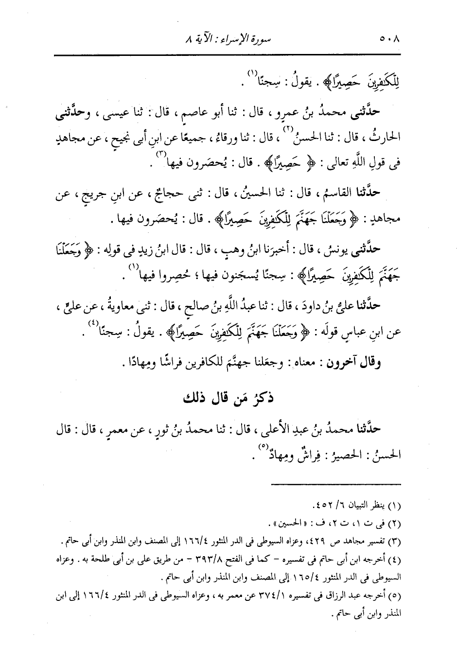 - حَدَّثَنَا عَلِيُّ بْنُ دَاوُدَ، قَالَ: ثنا عَبْدُ اللَّهِ بْنُ صَالِحٍ، قَالَ: ثني مُعَاوِيَةُ، عَنْ عَلِيٍّ، عَنِ ابْنِ عَبَّاسٍ، §قَوْلِهِ {وَجَعَلْنَا جَهَنَّمَ لِلْكَافِرِينَ حَصِيرًا} [الإسراء: 8] يَقُولُ: سِجْنًا وَقَالَ آخَرُونَ: مَعْنَاهُ: وَجَعَلْنَا جَهَنَّمَ لِلْكَافِرِينَ فِرَاشًا وَمِهَادًا