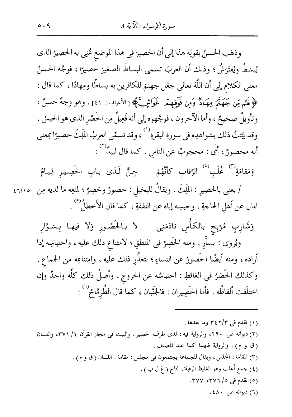 وَذَهَبَ الْحَسَنُ بِقَوْلِهِ هَذَا إِلَى أَنَّ الْحَصِيرَ فِي هَذَا الْمَوْضِعِ عُنِيَ بِهِ الْحَصِيرُ الَّذِي يُبْسَطُ وَيُفْتَرَشُ، وَذَلِكَ أَنَّ الْعَرَبَ تُسَمِّي الْبِسَاطَ الصَّغِيرَ حَصِيرًا، فَوَجَّهَ الْحَسَنُ مَعْنَى الْكَلَامِ إِلَى أَنَّ اللَّهَ تَعَالَى جَعَلَ جَهَنَّمَ لِلْكَافِرِينَ بِهِ بِسَاطًا وَمِهَادًا، كَمَا قَالَ: {لَهُمْ مِنْ جَهَنَّمَ مِهَادٌ وَمِنْ فَوْقِهِمْ غَوَاشٍ} [الأعراف: 41] وَهُوَ وَجْهٌ حَسَنٌ وَتَأْوِيلٌ صَحِيحٌ وَأَمَّا الْآخَرُونَ، فَوَجَّهُوهُ إِلَى أَنَّهُ فَعِيلٌ. مِنَ الْحَصْرِ الَّذِي هُوَ الْحَبْسُ. وَقَدْ بَيَّنْتُ ذَلِكَ بِشَوَاهِدِهِ فِي سُورَةِ الْبَقَرَةِ، وَقَدْ تُسَمِّي الْعَرَبُ الْمَلِكَ حَصِيرًا بِمَعْنَى أَنَّهُ مَحْصُورٌ: أَيْ مَحْجُوبٌ عَنِ النَّاسِ، كَمَا قَالَ لَبِيدٌ: