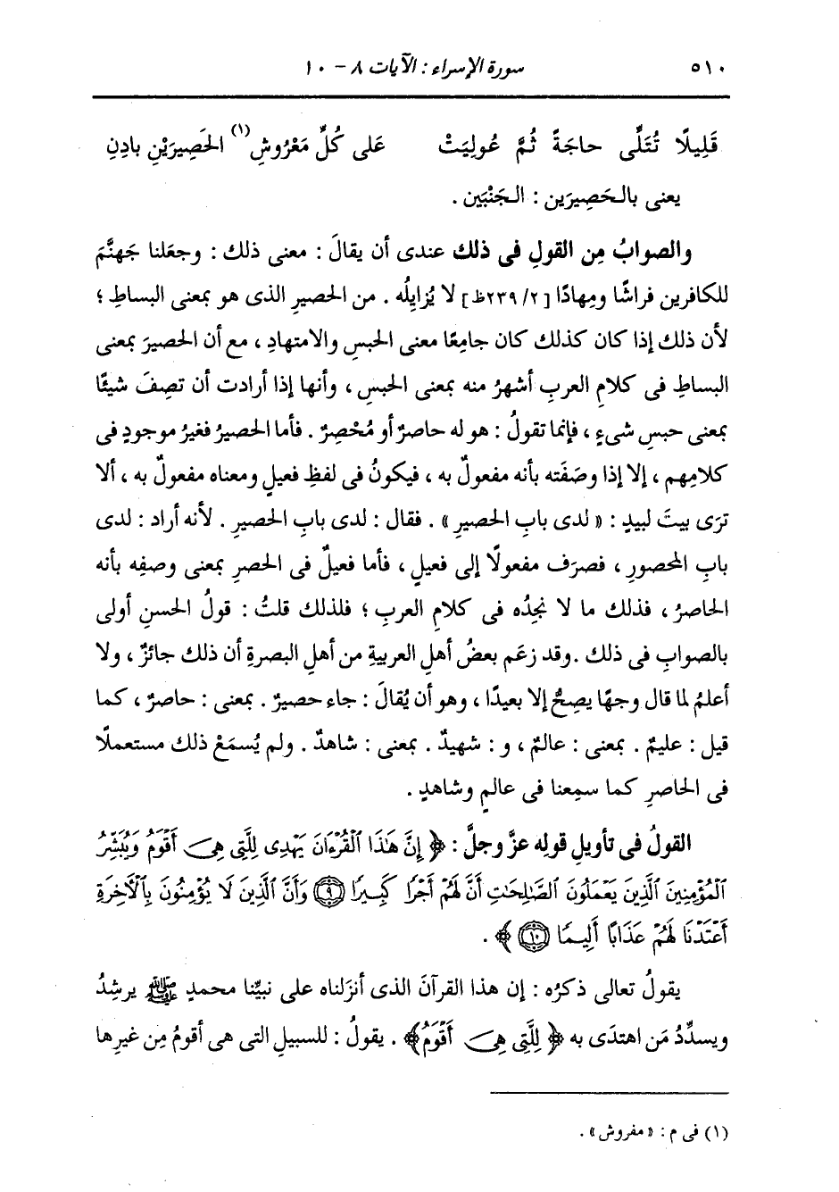 يَعْنِي بِالْحَصِيرَيْنِ: الْجَنْبَيْنِ. وَالصَّوَابُ مِنَ الْقَوْلِ فِي ذَلِكَ عِنْدِي أَيْ يُقَالُ: مَعْنَى ذَلِكَ: {وَجَعَلْنَا جَهَنَّمَ لِلْكَافِرِينَ حَصِيرًا} [الإسراء: 8] فِرَاشًا وَمِهَادًا لَا يُزَايِلُهُ، مِنَ الْحَصِيرِ الَّذِي بِمَعْنَى الْبِسَاطِ، لِأَنَّ ذَلِكَ إِذَا كَانَ كَذَلِكَ كَانَ جَامِعًا مَعْنَى الْحَبْسِ وَالِامْتِهَادِ، مَعَ أَنَّ الْحَصِيرَ بِمَعْنَى الْبِسَاطِ فِي كَلَامِ الْعَرَبِ أَشْهَرُ مِنْهُ بِمَعْنَى الْحَبْسِ، وَأَنَّهَا إِذَا أَرَادَتْ أَنْ تَصِفَ شَيْئًا بِمَعْنَى حُبِسَ شَيْءٌ، فَإِنَّمَا تَقُولُ: هُوَ لَهُ حَاصِرٌ أَوْ مُحْصِرٌ، فَأَمَّا الْحَصِيرُ فَغَيْرُ مَوْجُودٍ فِي كَلَامِهِمْ، إِلَّا إِذَا وَصَفَتْهُ بِأَنَّهُ مَفْعُولٌ بِهِ، فَيَكُونُ فِي لَفْظِ فَعِيلٍ، وَمَعْنَاهُ مَفْعُولٌ بِهِ، أَلَا تَرَى بَيْتَ لَبِيدٍ: لَدَى بَابِ الْحَصِيرِ؟ فَقَالَ: لَدَى بَابِ الْحَصِيرِ، لِأَنَّهُ أَرَادَ: لَدَى بَابِ الْمَحْصُورِ، فَصَرَفَ مَفْعُولًا إِلَى فَعِيلٍ. فَأَمَّا فَعِيلٌ فِي الْحَصْرِ بِمَعْنَى وَصْفِهِ بِأَنَّهُ الْحَاصِرُ. فَذَلِكَ مَا لَا نَجِدُهُ فِي كَلَامِ الْعَرَبِ، فَلِذَلِكَ قُلْتُ: قَوْلُ الْحَسَنِ أَوْلَى بِالصَّوَابِ فِي ذَلِكَ. وَقَدْ زَعَمَ بَعْضُ أَهْلِ الْعَرَبِيَّةِ مِنْ أَهْلِ الْبَصْرَةِ أَنَّ ذَلِكَ جَائِزٌ، وَلَا أَعْلَمُ لِمَا قَالَ وَجْهًا يَصِحُّ إِلَّا بَعِيدًا وَهُوَ أَنْ يُقَالَ: جَاءَ حَصِيرٌ بِمَعْنَى حَاصِرٍ، كَمَا قِيلَ: عَلِيمٌ بِمَعْنَى عَالِمٍ، وَشَهِيدٌ بِمَعْنَى شَاهِدٍ، وَلَمْ يُسْمَعْ ذَلِكَ مُسْتَعْمَلًا فِي الْحَاصِرِ كَمَا سَمِعْنَا فِي عَالِمٍ وَشَاهِدٍ