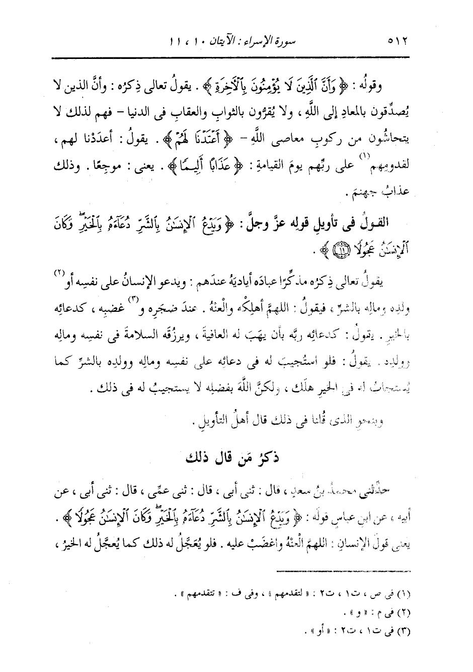 §الْقَوْلُ فِي تَأْوِيلِ قَوْلِهِ تَعَالَى: {وَيَدْعُ الْإِنْسَانُ بِالشَّرِّ دُعَاءَهُ بِالْخَيْرِ وَكَانَ الْإِنْسَانُ عَجُولًا} [الإسراء: 11] يَقُولُ تَعَالَى ذِكْرُهُ مُذَكِّرًا عِبَادَهُ أَيَادِيهِ عِنْدَهُمْ، وَيَدْعُو الْإِنْسَانُ عَلَى نَفْسِهِ وَوَلَدِهِ وَمَالِهِ بِالشَّرِّ، فَيَقُولُ: اللَّهُمَّ أَهْلِكْهُ وَالْعَنْهُ عِنْدَ ضَجَرِهِ وَغَضَبِهِ، كُدَعَائِهِ بِالْخَيْرِ: يَقُولُ: كُدَعَائِهِ رَبَّهُ بِأَنْ يَهَبَ لَهُ الْعَافِيَةَ، وَيَرْزُقَهُ السَّلَامَةَ فِي نَفْسِهِ وَمَالِهِ وَوَلَدِهِ، يَقُولُ: فَلَوِ اسْتُجِيبَ لَهُ فِي دُعَائِهِ عَلَى نَفْسِهِ وَمَالِهِ وَوَلَدِهِ بِالشَّرِّ كَمَا يُسْتَجَابُ لَهُ فِي الْخَيْرِ هَلَكَ، وَلَكِنَّ اللَّهَ بِفَضْلِهِ لَا يَسْتَجِيبُ لَهُ فِي ذَلِكَ. وَبِنَحْوِ الَّذِي قُلْنَا فِي ذَلِكَ، قَالَ أَهْلُ التَّأْوِيلِ